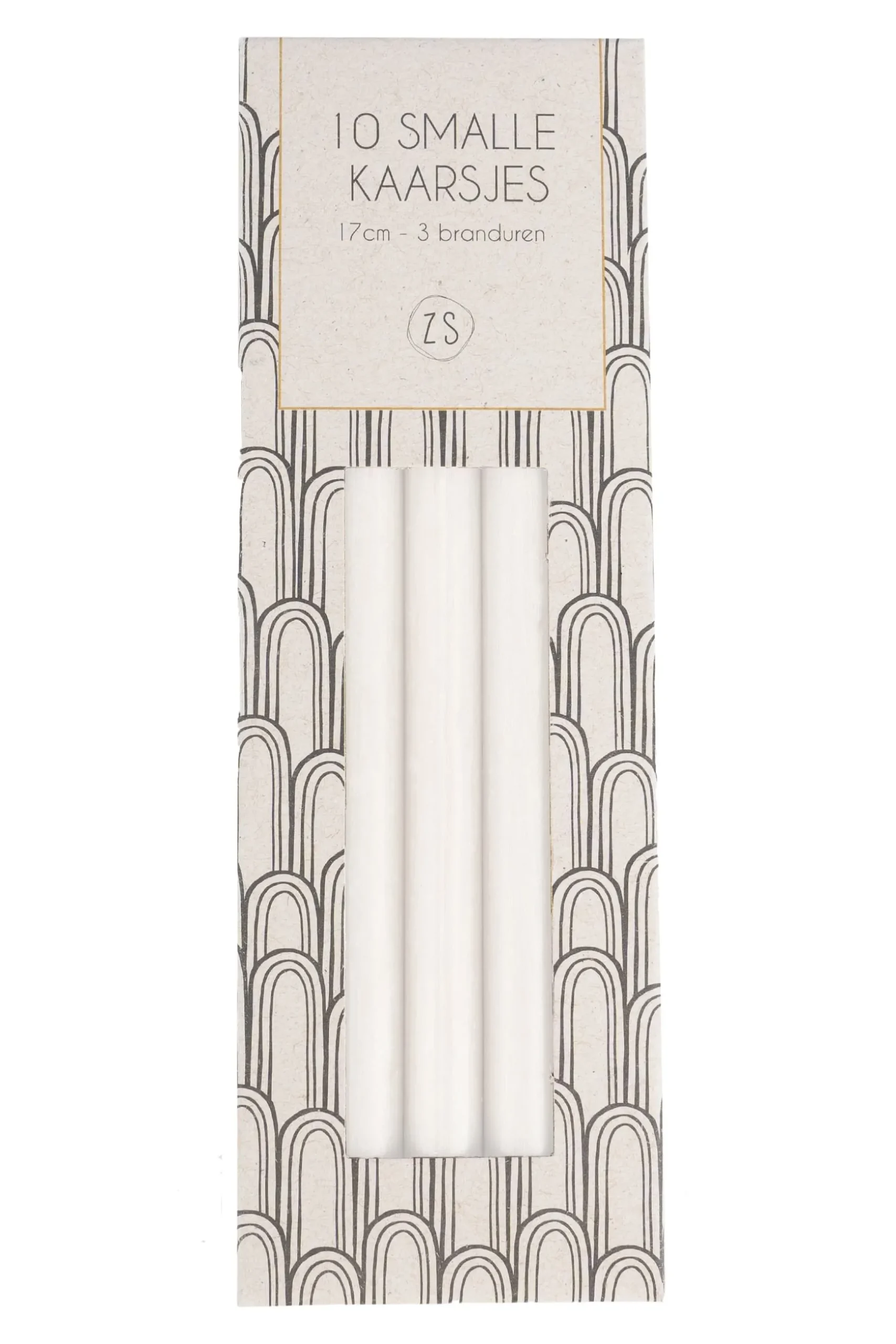Zusss doosje met 10 smalle kaarsjes|Door kaarsjes te branden maak je het extra gezellig in huis, vooral in het najaar! Handig dus om dan een voorraadje in huis te hebben. In dit doosje zitten 10 krijt kleurige Zusss kaarsjes. De kaarsjes zijn 17 centimeter lang en hebben een doorsnede van 1,2 centimeter. Elk kaarsje heeft ruim 3 branduren. Neem eens een kijkje bij de Zusss kaarsenhouder voor een perfecte houder voor deze mooie kaarsjes.|Zusss: basic, stoer, uniek en een tikkeltje eigenwijs.