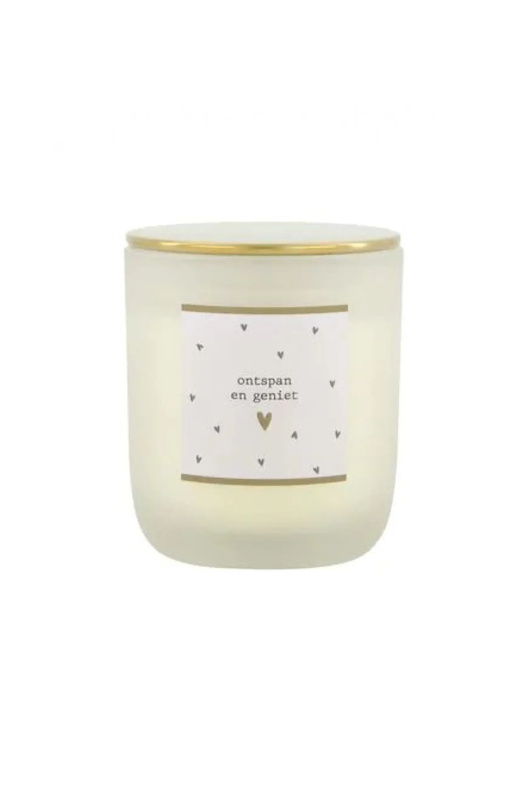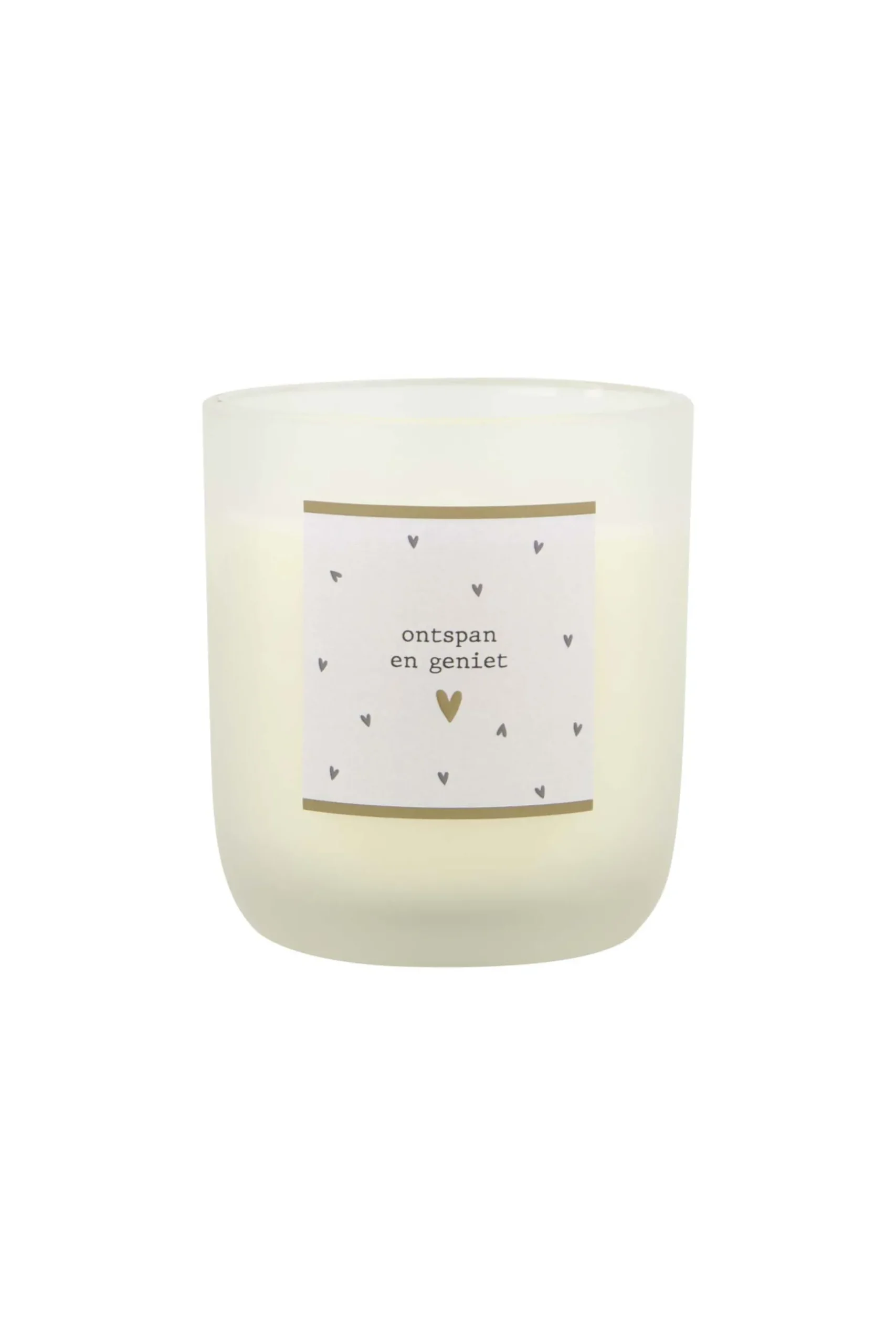 Zusss geurkaars in glas ontspan en geniet wit|Hoe leuk is deze geurkaars van Zusss! Op het glas zit een etiket met daarop de tekst: ontspan en geniet. Met het deksel kun je de geurkaars afsluiten, ideaal! Met deze geurkaars verspreidt je een warme, kruidige geur van crackling hearth, waardoor je een knusse en gezellige sfeer creëert. Het formaat van de kaars is 8x9cm en heeft ca 35 branduren. Verras jezelf of een ander met dit leuke kado! |Zusss: basic, stoer, uniek en een tikkeltje eigenwijs.
