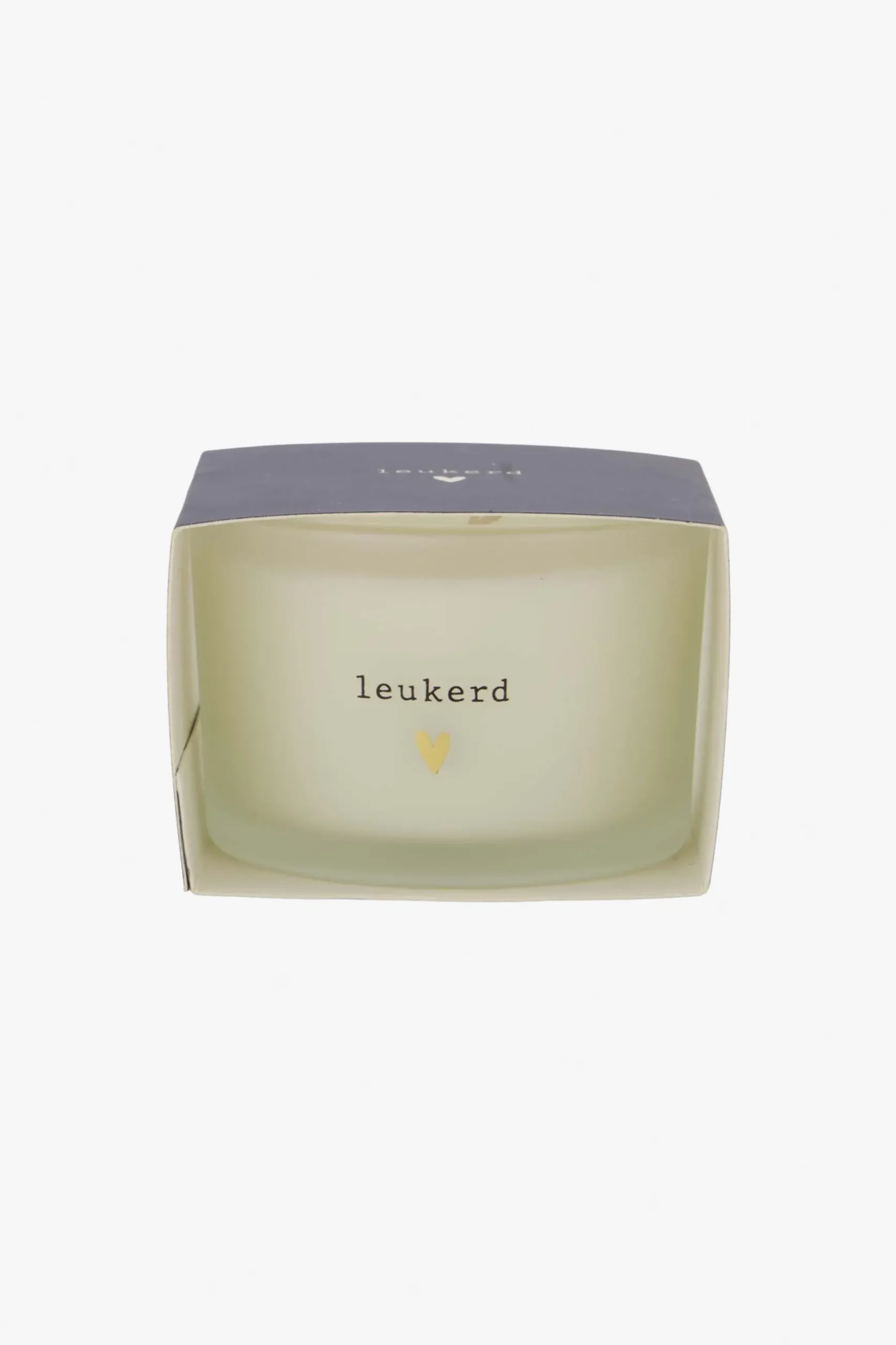Zusss geurkaars in wikkel leukerd blauw|Deze geurkaars van Zusss ziet er o zo leuk uit! Het liefst laat je de wikkel er omheen zitten. Om deze geurkaars zit een blauwe wikkel met een hartje en de tekst: leukerd. Het glaasje heeft een diameter van 7,5cm en is 7,5cm hoog. Dit item is ook erg leuk als kadootje!|Zusss: basic, stoer, uniek en een tikkeltje eigenwijs.