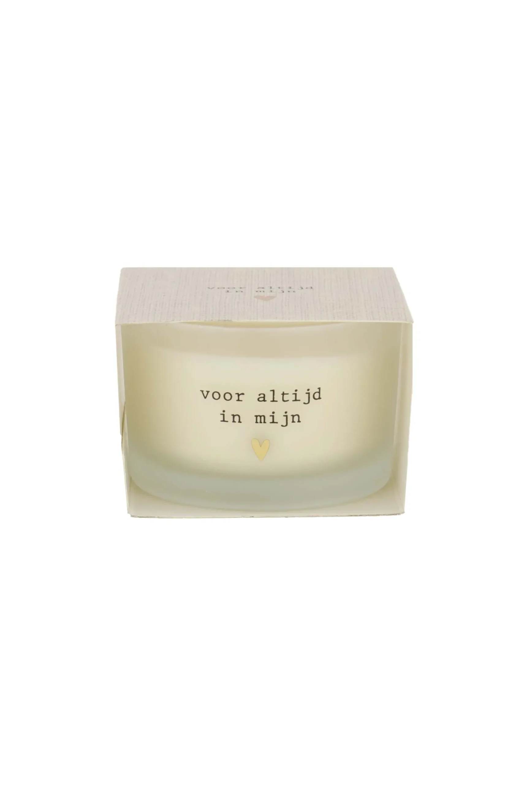 Zusss geurkaars in wikkel altijd in mijn hart linnen|Deze geurkaars van Zusss ziet eruit als een hart onder de riem. Om de geurkaars zit een wikkel in de kleur peper en zout met daarop de tekst: voor altijd in mijn hart. Het glaasje heeft een diameter van 7,5cm en is 7,5cm hoog. Een mooi kadootje om iemand sterkte mee te wensen.|Zusss: basic, stoer, uniek en een tikkeltje eigenwijs.