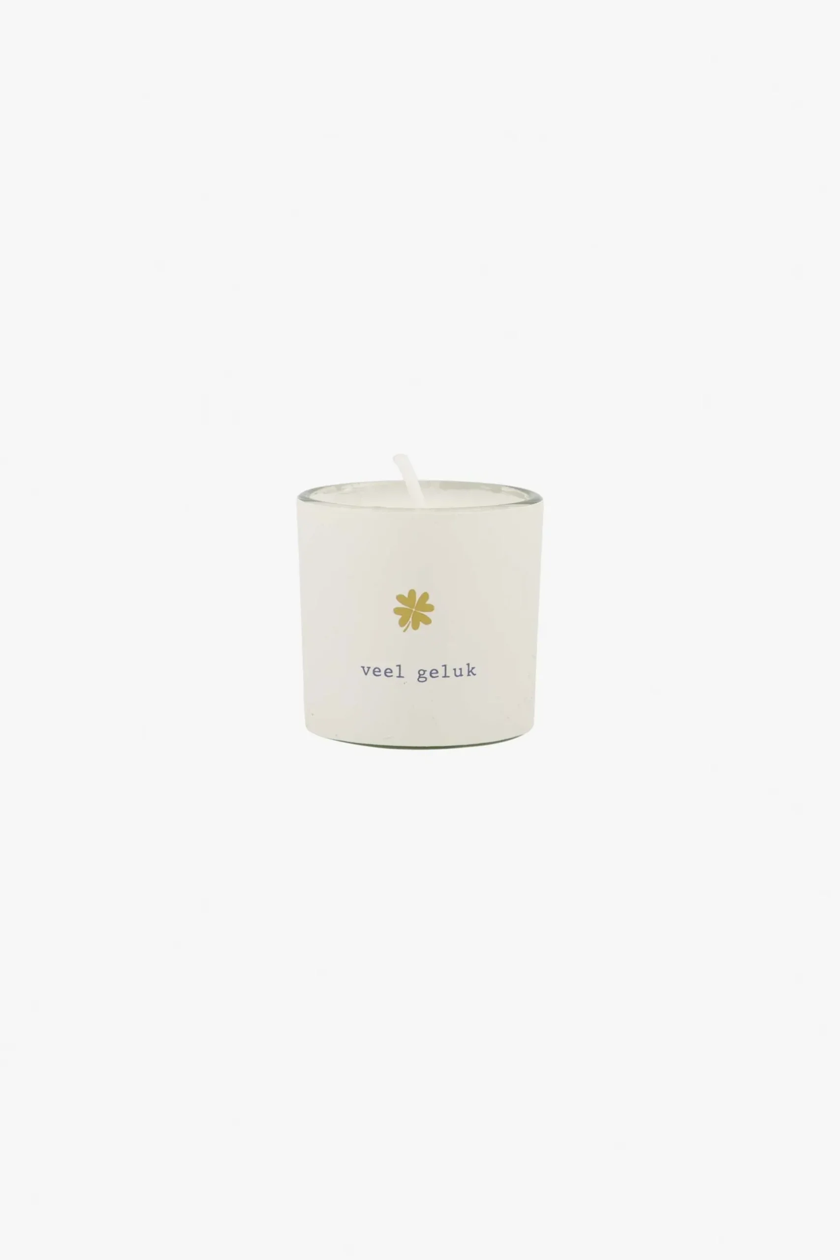 Zusss geurkaarsje in wikkel veel geluk donkerblauw|Dit geurkaarsje van Zusss ziet er gezellig uit en ruikt ook nog eens lekker naar fresh linen! Om deze geurkaars zit een witte wikkel met daarop een goud klavertje en de tekst: veel geluk. Perfect om iemand succes te wensen met bijvoorbeeld een nieuwe uitdaging of als klein cadeautje voor een bruiloft, bijv. bij een envelopje! Het glaasje heeft een diameter van 4,7cm, is 4,4cm hoog en heeft ca 8 branduren.|Zusss: basic, stoer, uniek en een tikkeltje eigenwijs.