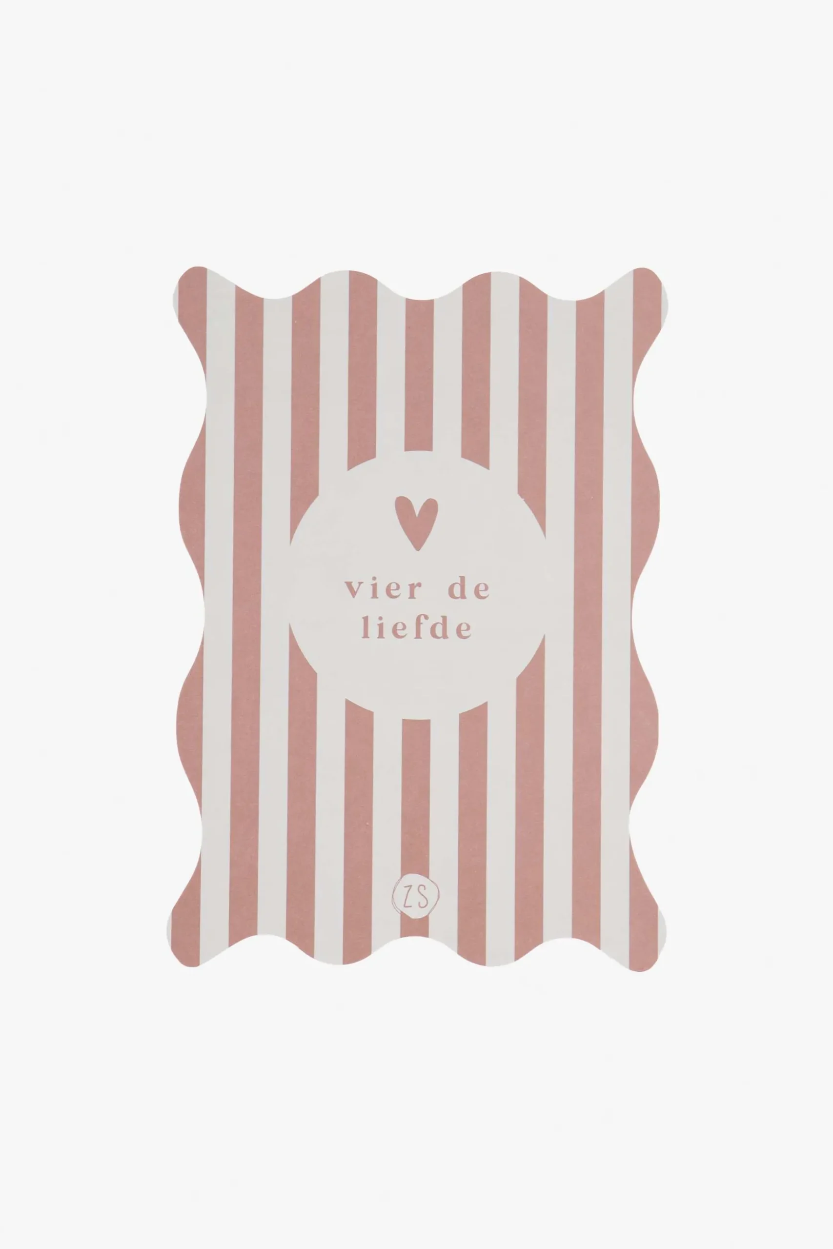 Zusss kaart golf vier de liefde terra roze/zand|Met een lief kaartje tover je al gauw een glimlach op iemands gezicht! Deze ansichtkaart is voorzien van een gestreepte achtergrond met in het midden de tekst: vier de liefde. De achterkant van de kaart is wit van kleur. Links is open ruimte om te schrijven. Rechts staan er lijntjes voor de naam en het adres van de ontvanger. Jouw postzegel kun je rechtsbovenin plaatsen. Maar heb je geen postzegel nodig, dan staat hier een lief hartje afgebeeld. Tip: neem een kijkje bij de Zusss spullen voor in huis!|Zusss: basic, stoer, uniek en een tikkeltje eigenwijs.