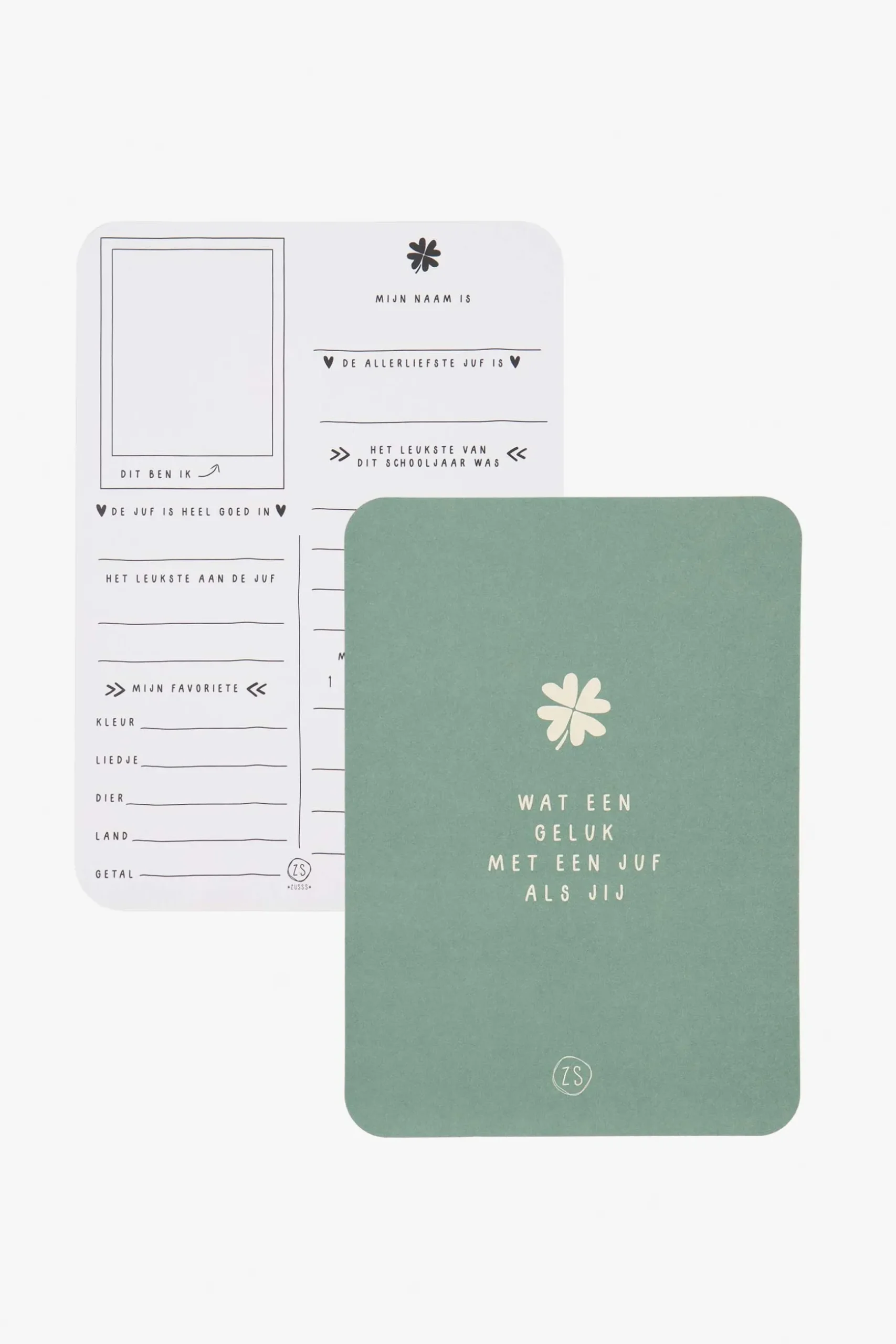 Zusss kaart wat een geluk met een juf zoals jij saliegroen|Wie verras jij met deze leuke Zusss kaart? Ken jij een leuke juf, heb je een leuke juf of ben jij zelfs zo’n leukerd? Deze kaart is speciaal voor de allerbeste juf! Geef ‘m op juffen- en meesterdag aan het einde van het schooljaar, of gewoon zomaar! Tip: neem een kijkje bij de Zusss spullen voor in huis!|Zusss: basic, stoer, uniek en een tikkeltje eigenwijs.