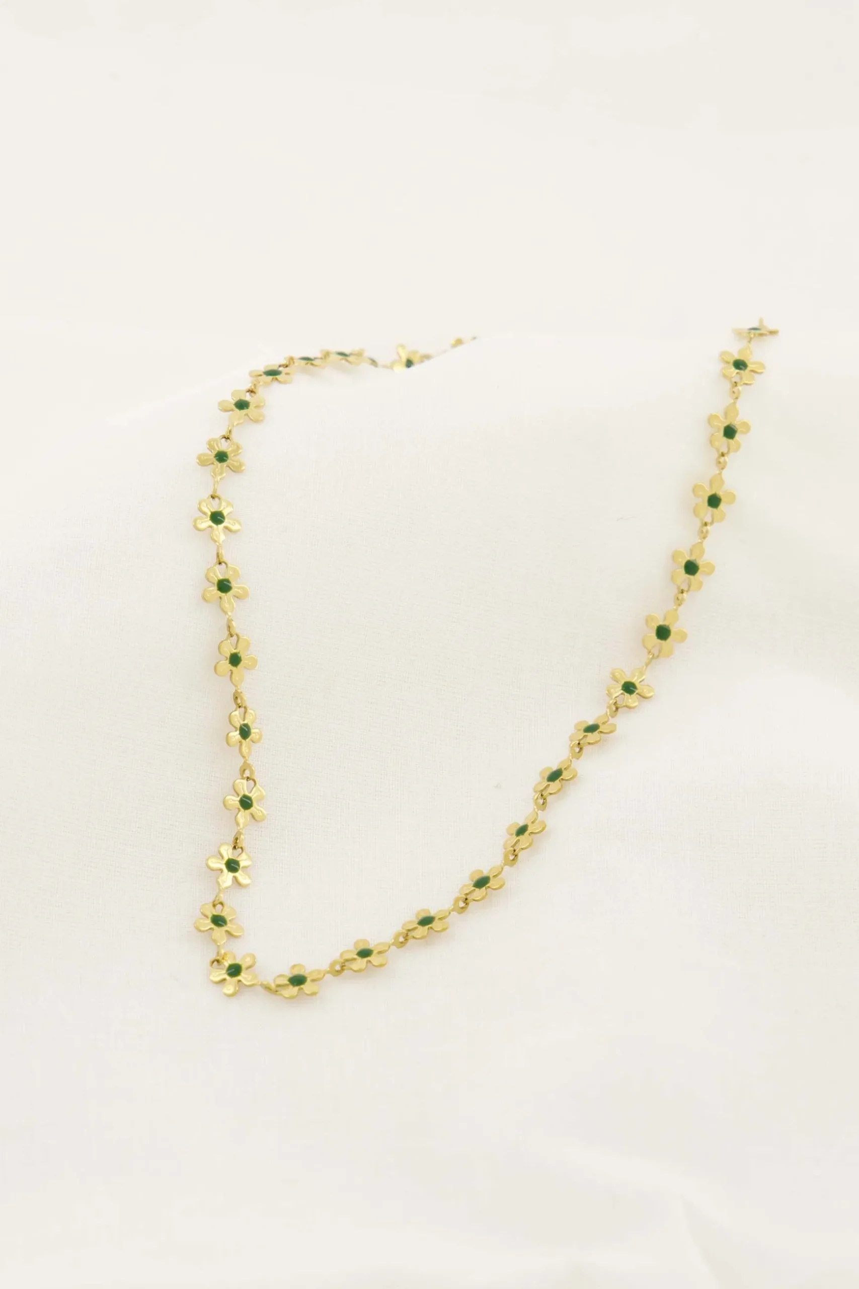 Zusss ketting met bloemen donkergroen|Voeg een vleugje verfijning to aan je look met deze ketting van Zusss. Deze gouden ketting met bloemen, met in het hart een subtiel donkergroen stipje, straalt charme uit. Wist je dat we nog meer mooimakers met bloemen hebben? Deze kun je perfect met elkaar combineren. Omdat de ketting is gemaakt van stainless steel verkleurd deze niet. Dit item is verstelbaar van 40 tot 45 cm. Ook leuk om kado te geven!|Zusss: basic, stoer, uniek en een tikkeltje eigenwijs.