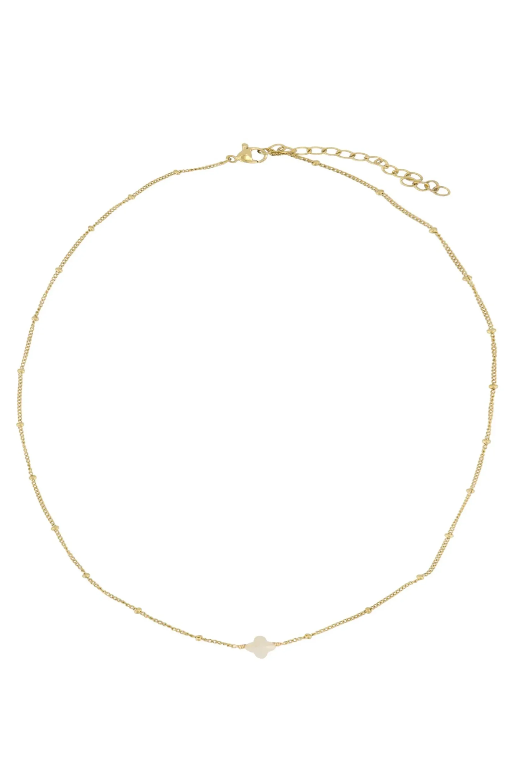 Zusss ketting met bloemsteentje creme/goud|Zo mooi, deze ketting met bloemsteentje! Deze past werkelijk bij iedere outfit. Het cremekleurige steentje hangt aan een gouden ketting van 23cm die verstelbaar is. Het goud is gemaakt van stainless steel en verkleurd daardoor niet. Met welke mooimakers match jij deze leuke ketting? Neem ook een kijkje bij de kleding van Zusss!|Zusss: basic, stoer, uniek en een tikkeltje eigenwijs.