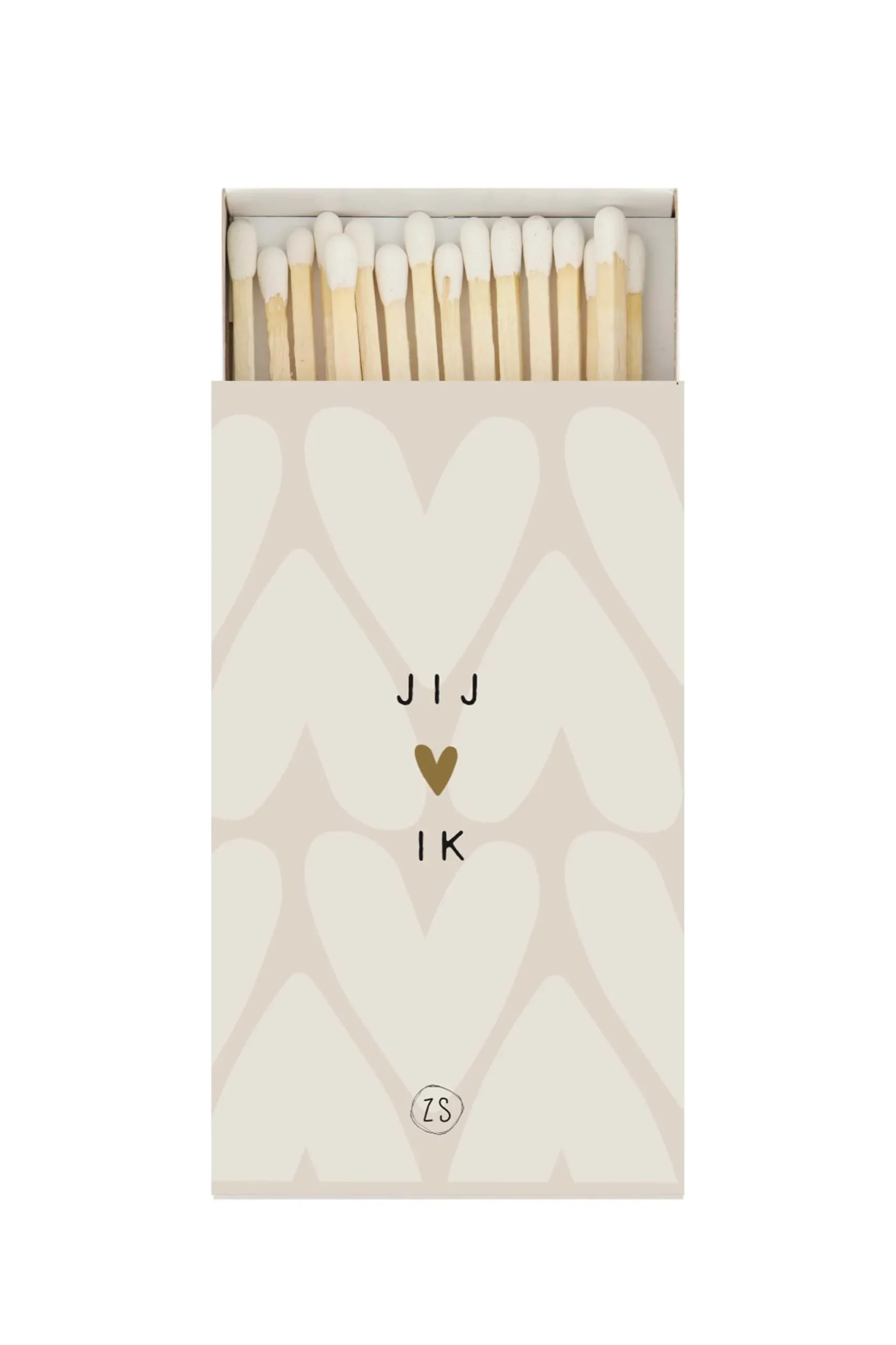 Zusss lucifers jij & ik zand|Dit doosje lucifers van Zusss mag zeker gezien worden! Geef ‘m een mooi plekje in je interieur. De lucifers zijn verpakt in een zandkleurig doosje met hartjes. In het midden staat de tekst: jij & ik. Onderaan de voorkant vind je het Zusss logo. Ook erg leuk als kadootje!|Zusss: basic, stoer, uniek en een tikkeltje eigenwijs.