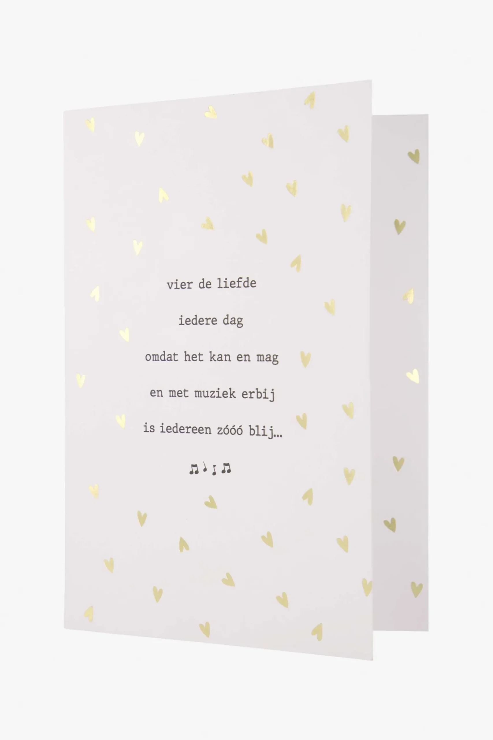 Zusss muziekkaart vier de liefde|Met een kaartje tover jij al gauw een glimlach om iemand zijn gezicht. Maar met deze muziekkaart met het nummer Love is in the air van John Paul Young, maak je hem of haar écht blij! Op deze witte kaart staan gouden hartjes en een leuk gedichtje op de voorkant. Het allerleukst is natuurlijk het muziekje erbij! Verwijder het plasticje, doe de kaart dicht en geef de kaart aan iemand cadeau. Wanneer de ontvanger de kaart opent speelt de muziek automatisch af. Wie maak jij blij met deze leuke kaart? Wil je het plaatje helemaal compleet maken? Combineer deze kaart dan met een leuk Zusss liefdeskadootje!|Zusss: basic, stoer, uniek en een tikkeltje eigenwijs.