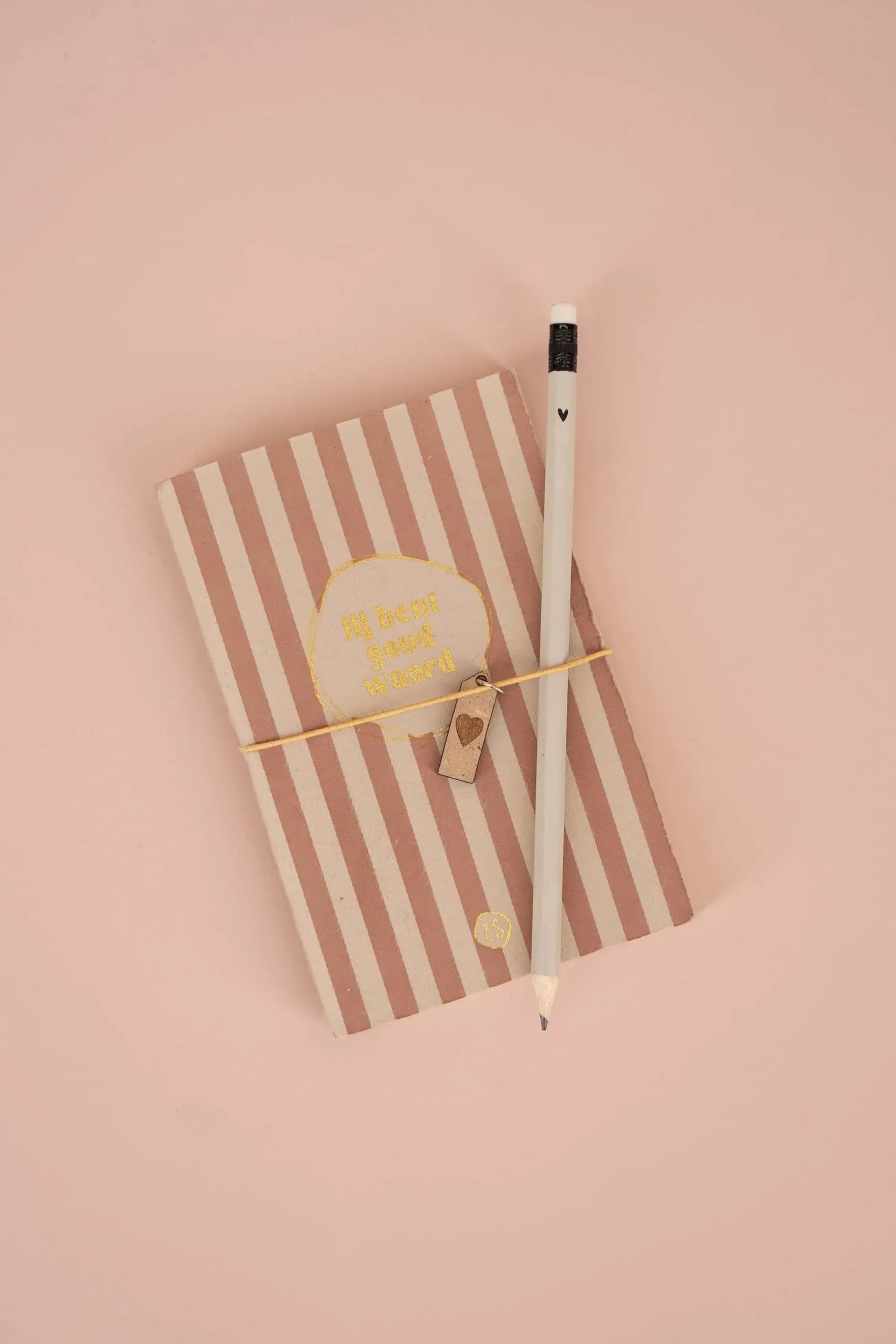 Zusss notitieboekje geniet jij bent goud waard terra roze/zand|In dit notitieboekje van Zusss schrijf jij voortaan al jouw belangrijke aantekeningen en ideeën op. De omslag is voorzien van een zand en terra roze streepjes en de tekst: jij bent goud waard. Het notitieboekje heeft blanco pagina’s waardoor je ‘m helemaal op je eigen manier in kunt vullen. Het boekje is voorzien van een elastiek waardoor je notitieboek goed dicht blijft zitten! Tip: neem ook een kijkje bij de Zusss spullen voor in huis!|Zusss: basic, stoer, uniek en een tikkeltje eigenwijs.