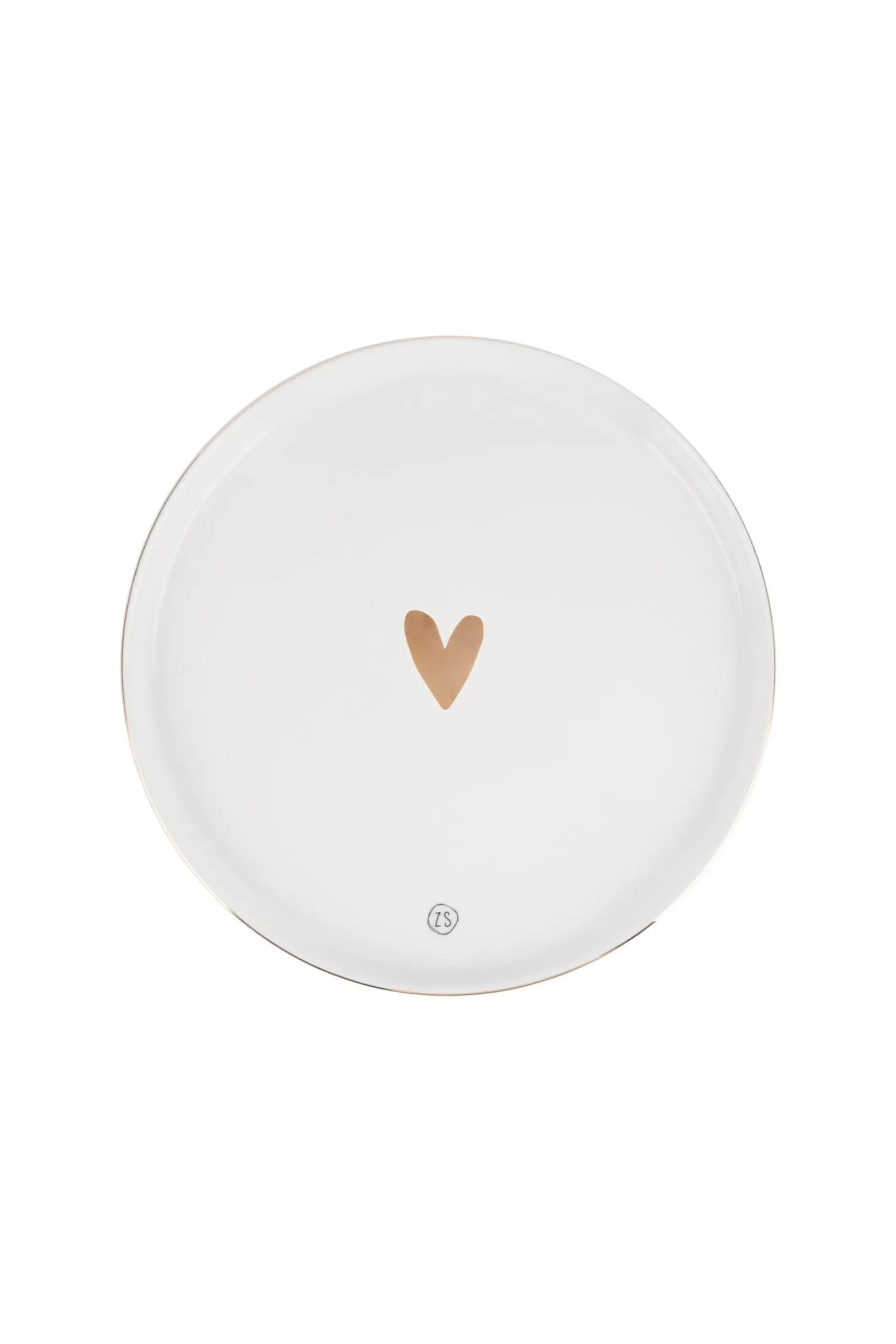Zusss ontbijtbord met goud hartje en randje|Ontbijtbordje van Zusss met een goud hartje en een gouden randje. Kenmerkend van goud geglazuurd servies is dat dit niet in de vaatwasser kan, vandaar dat je dit bordje ook met de hand af moet wassen. Het bord is gemaakt van aardewerk en is 22cm breed en 1,5cm dik. Op de voorkant van het bord vind je ook een subtiel Zusss logo. Leuk om deze borden te combineren met andere aardewerk items met gouden hartjes. Je bekijkt ze in de categorie servies.|Zusss: basic, stoer, uniek en een tikkeltje eigenwijs.