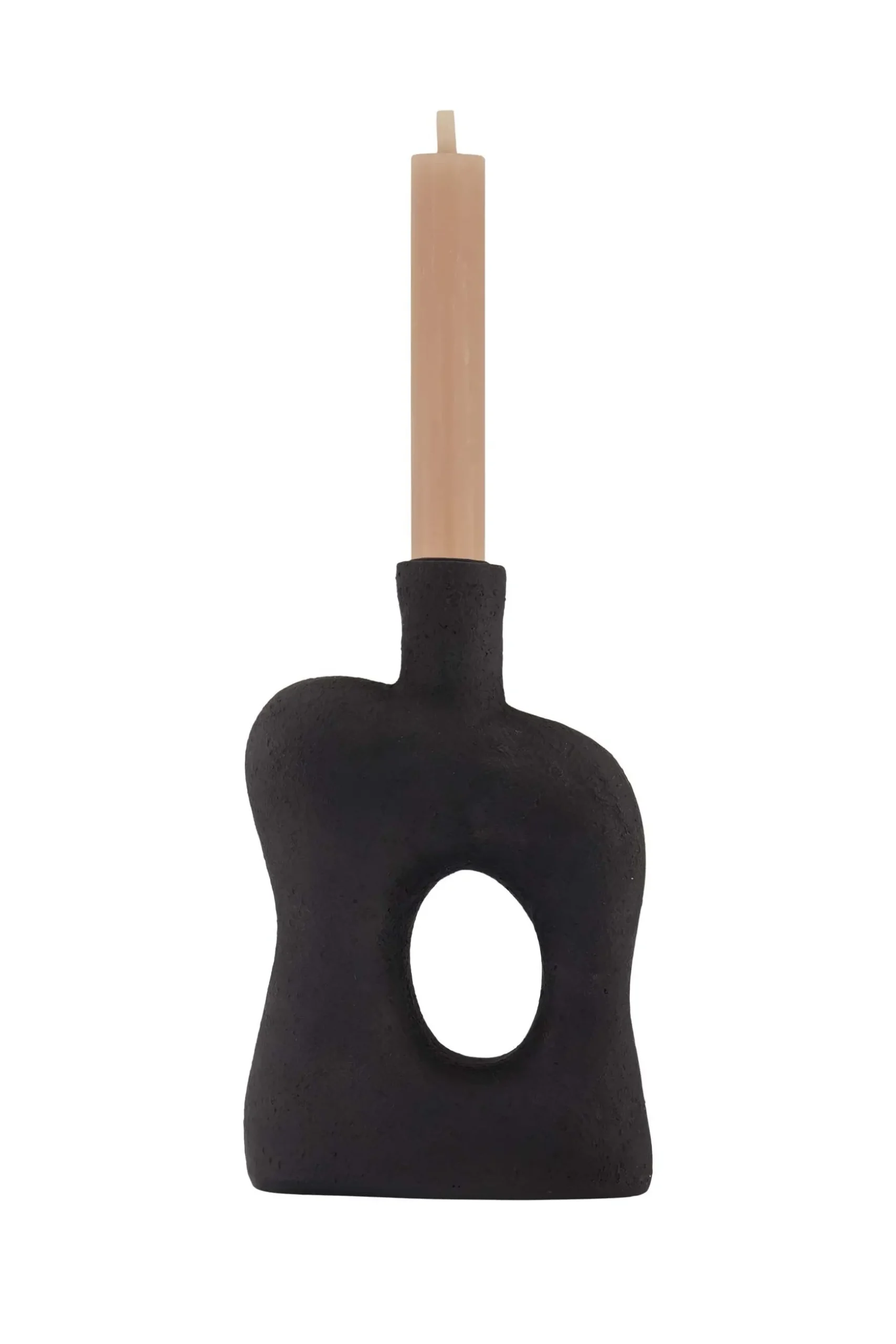 Zwarte polystone kandelaar van Zusss|Maak indruk met dit pronkstuk! De zwarte kleur valt goed op, maar combineert ook lekker met je andere zwarte eyecatchers. In deze kandelaar passen de rustieke Zusss kaarsen van 12cm en 20cm, en de geribbelde Zusss kaarsen van 20cm. Ook leuk: doe korte takjes of bloemetjes in de opening. Polystone lijkt op natuursteen, maar is veel lichter. Dit exemplaar is 15×6,5x22cm groot. Let wel: de polystone artikelen kunnen wat stof afgeven. Wij raden aan dit artikel met een vochtige doek af te nemen. Als je dit hebt gedaan, zal het artikel niet meer afgeven.|Zusss: basic, stoer, uniek en een tikkeltje eigenwijs.