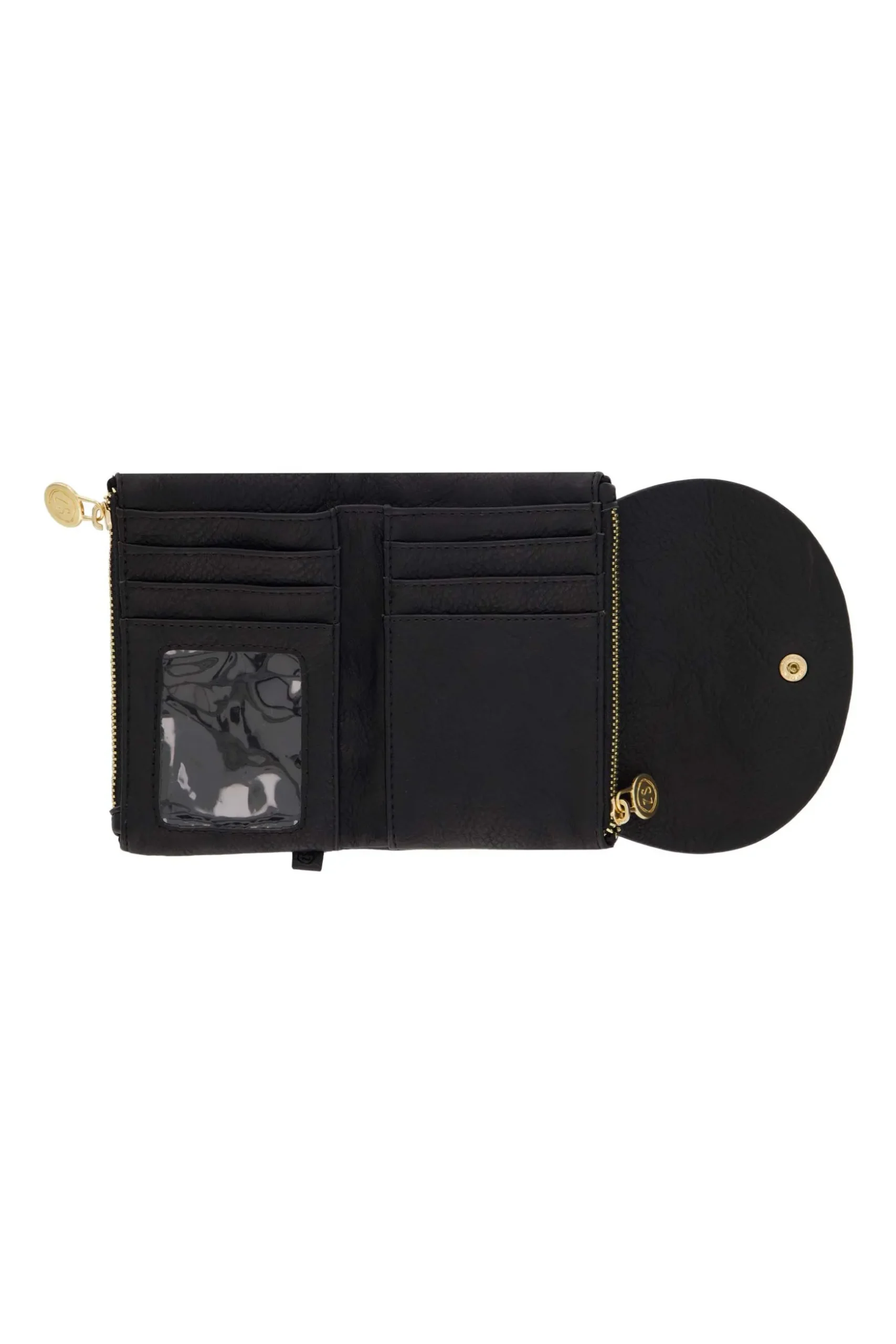 Zusss portemonnee zwart|Met deze portemonnee van Zusss heb je pasjes en geld bij de hand. Deze portemonnee is zwart van kleur en is gemaakt van PU leer. Het Zusss logo vind je terug op het PU labeltje aan de zijkant. Ook hangt er aan de ritssluiting een muntje met daarop het Zusss logo. Dit vakje met ritssluiting is ideaal om kleingeld in te op te bergen. De portemonnee sluit met een drukknoopje aan de voorkant. Dit item is ook erg leuk om kado te geven!|Zusss: basic, stoer, uniek en een tikkeltje eigenwijs.