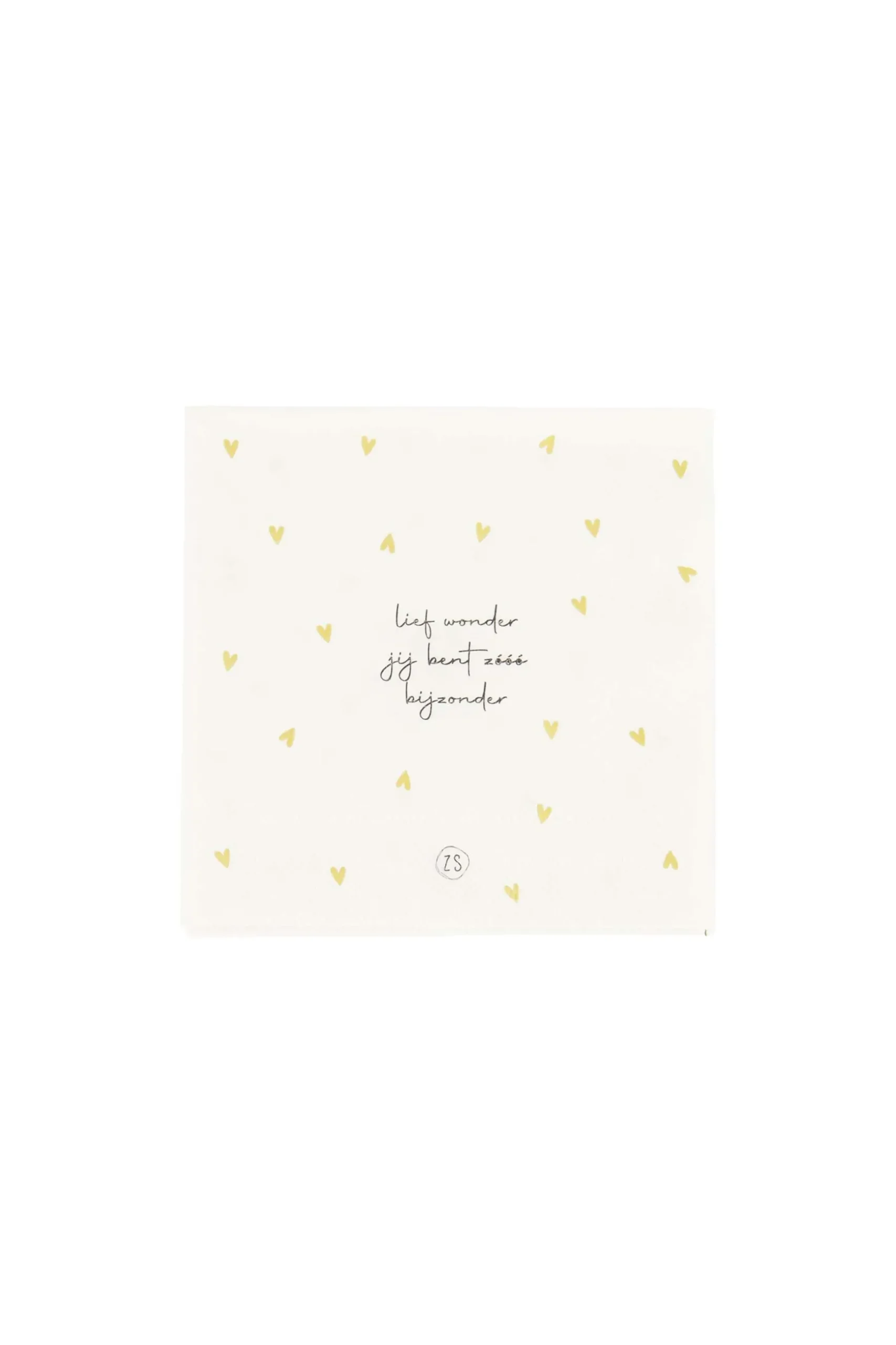 Zusss servetten lief wonder hartjes 12,5×12,5cm wit|Deze servetjes van Zusss zijn o zo leuk! Op de witte servetten staan goudkleurige hartjes en de tekst: lief wonder jij bent zóóó bijzonder. Speciaal om het kleine wondertje te vieren! De servetten worden geleverd in een pakje van 20 stuks en zijn 12,5×12,5cm groot. Ook erg leuk als kado!|Zusss: basic, stoer, uniek en een tikkeltje eigenwijs.