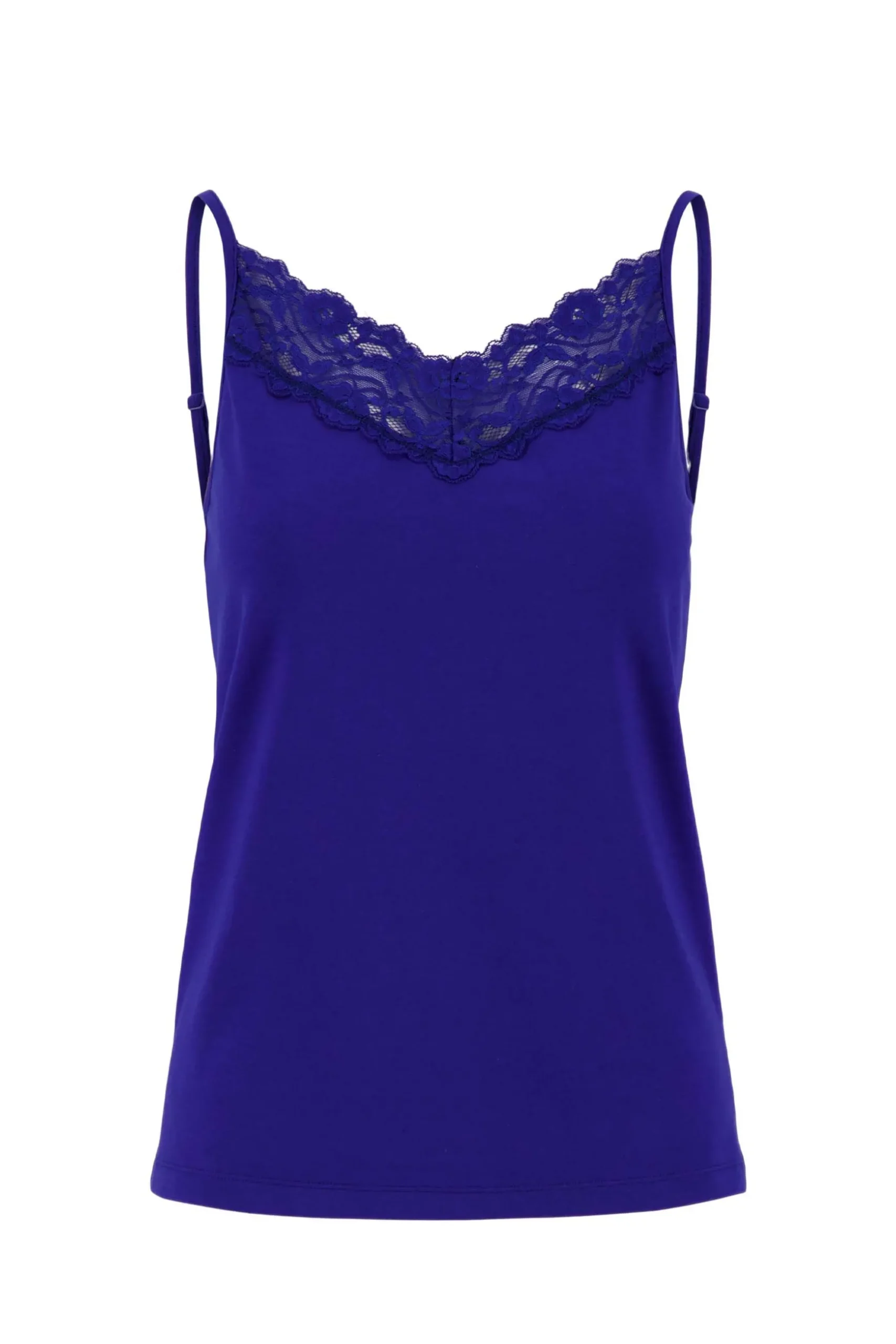 Zusss spaghetti top met kant kobaltblauw|Jaa deze wil je hebben! Een basic top komt altijd van pas. Deze fijne top van Zusss heeft spaghetti bandjes en een kanten rand bij de hals. Lekker sjiek! Je draagt ‘m zo of onder een Zusss blouse of vest. Met dit blauwe item kun je alle kant op! Deze leuke top is gemaakt van 57% katoen, 38% modal en 5% elastaan. Kijk ook eens bij de Zusss mooimakersom je outfit af te maken.|Zusss: basic, stoer, uniek en een tikkeltje eigenwijs.