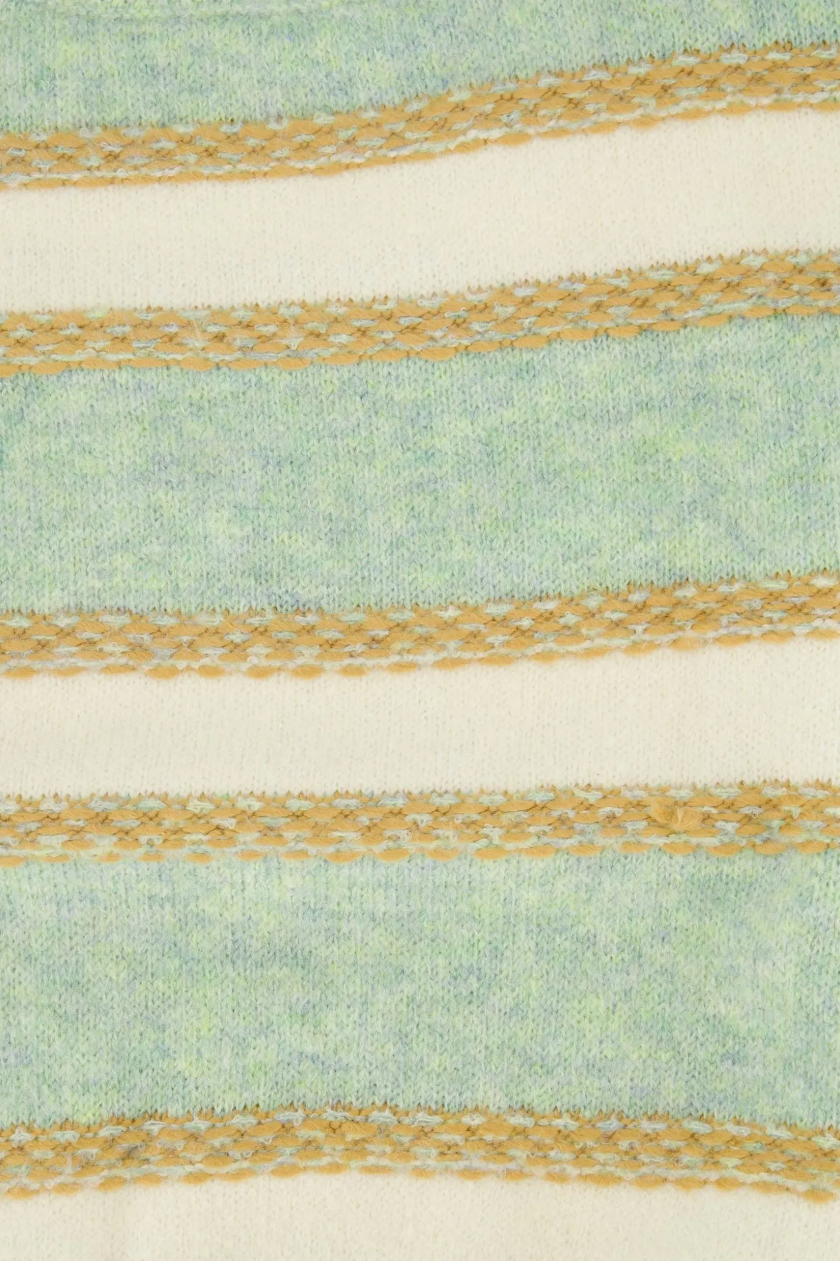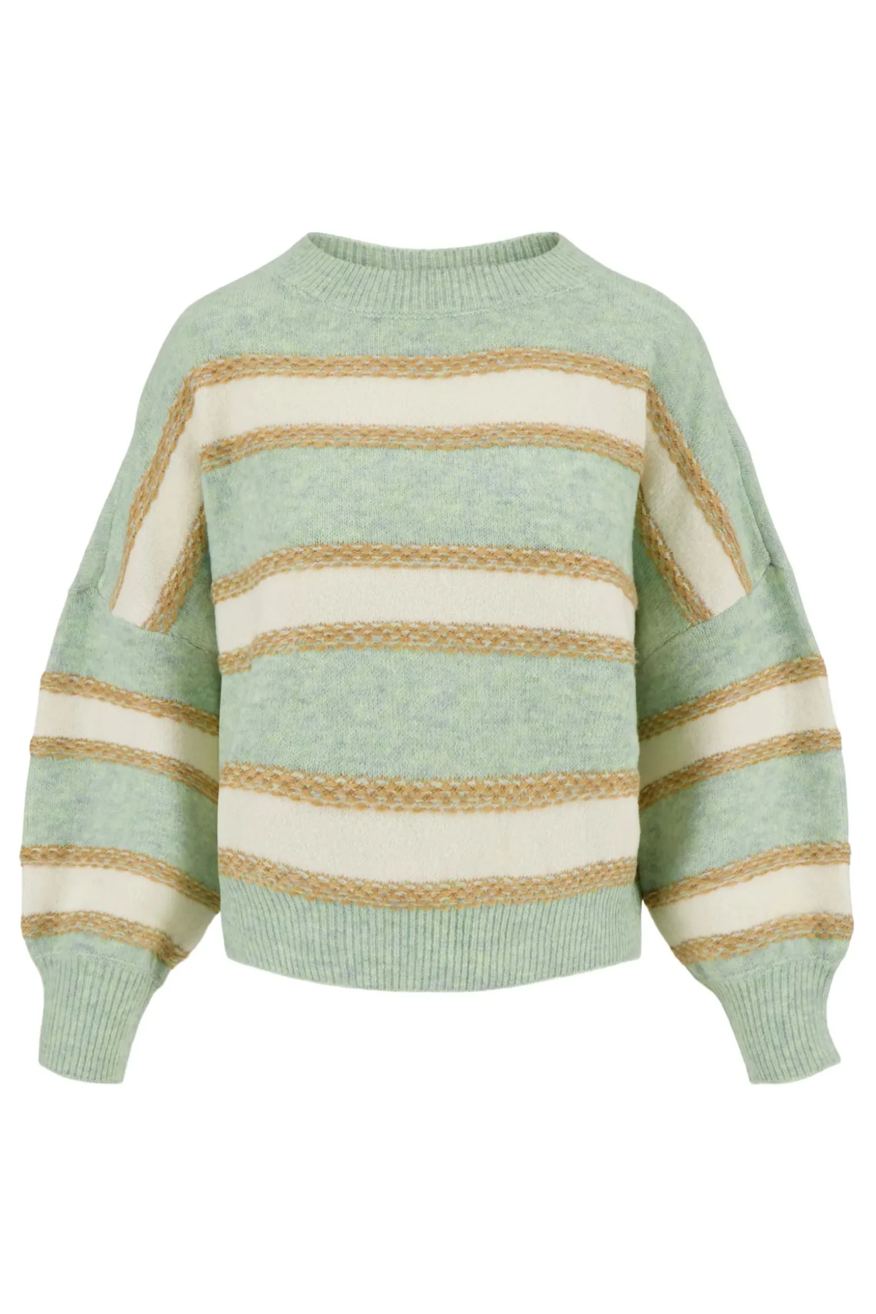 Zusss trui met strepen mint|Een zachte fijngebreide trui van Zusss. Met deze gestreepte trui kun je alle kanten op! Draag ‘m met een relaxte outfit voor een avondje op de bank of op een Zusss jeans voor een dagje uit. Heb jij al een gelegenheid in gedachten? De trui heeft lange mouwen en is gestreept in de kleuren: mint, crème en goud. Dit item is gemaakt van 47% acetaat, 22% nylon en 20% wol. Vergeet niet om een kijkje te nemen bij de rest van het Zusss kleding assortiment. Welk item combineer jij met deze trui?|Zusss: basic, stoer, uniek en een tikkeltje eigenwijs.