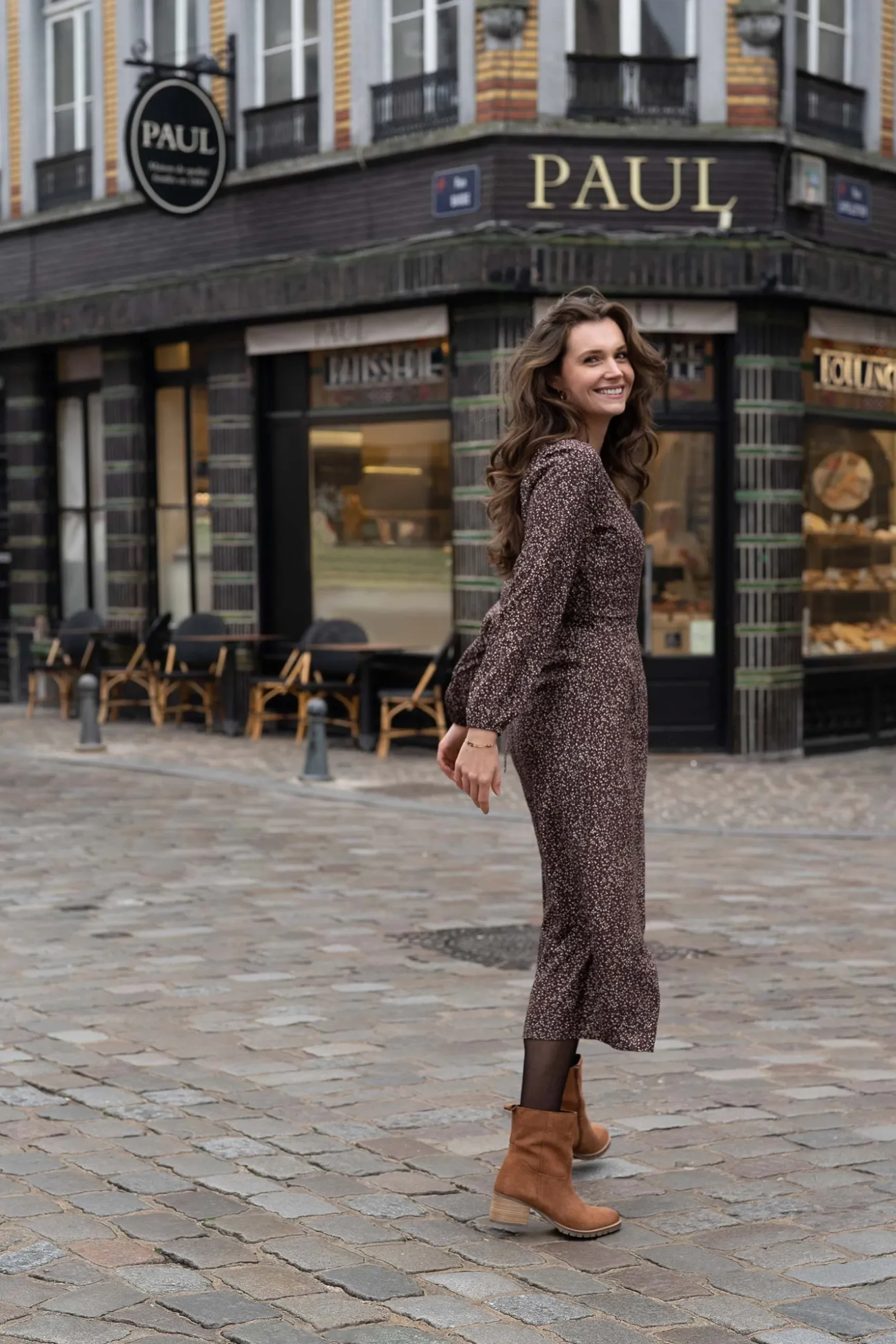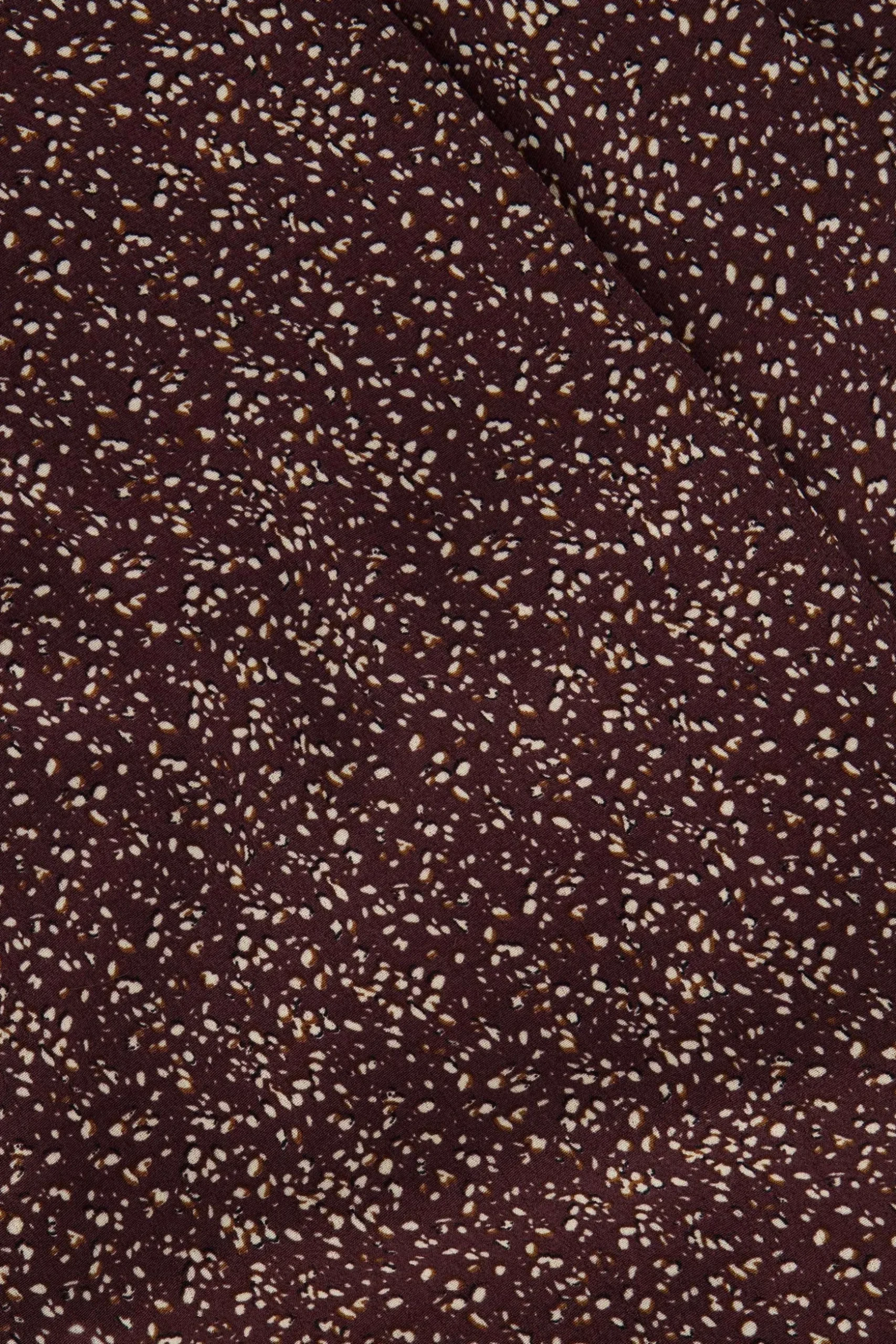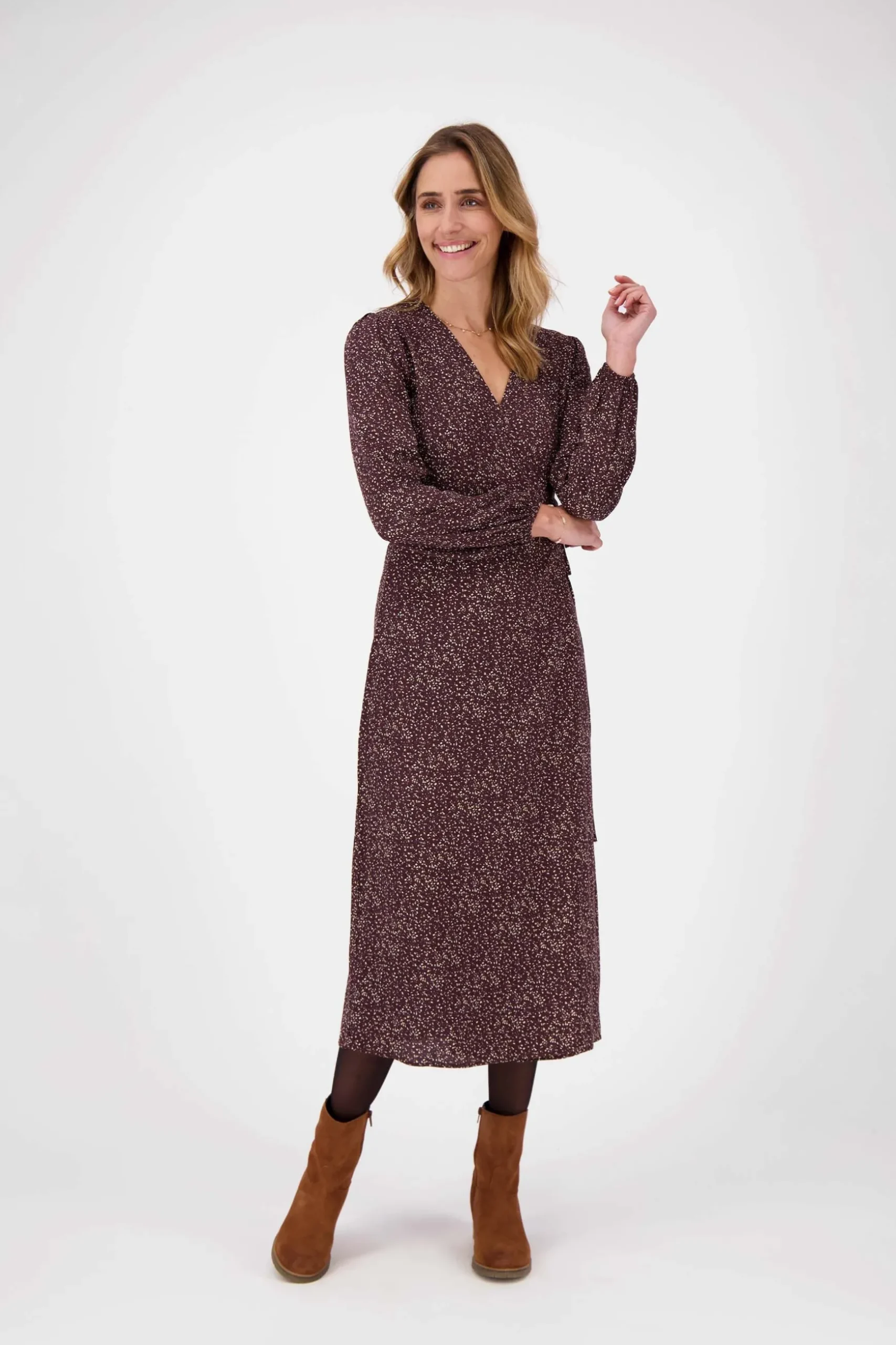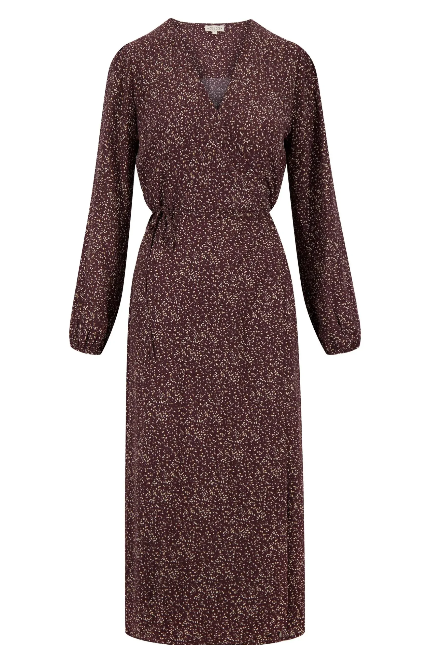 Chocoladebruine Zusss wikkeljurk met print| Oelala, deze chocoladebruine wikkeljurk accentueert precies wat je wilt. De V-hals is niet te diep en met de touwtjes in de zij maak je een leuke strik. De lange mouwen poffen een beetje en over de hele jurk zitten beige stippeltjes. Je trekt de jurk aan naar je werk met platte boots eronder of naar de verjaardag van je bestie met een hakje. Vind je de dunne stof te koud? Dan doe je er gewoon een dik, warm Zusss vest over aan. Dankzij dun 100% viscose valt de jurk lekker soepel en droogt hij na een wasbeurt snel. Was ‘m op 30 graden met soortgelijke kleuren en laat drogen op een hanger.|Zusss: basic, stoer, uniek en een tikkeltje eigenwijs.