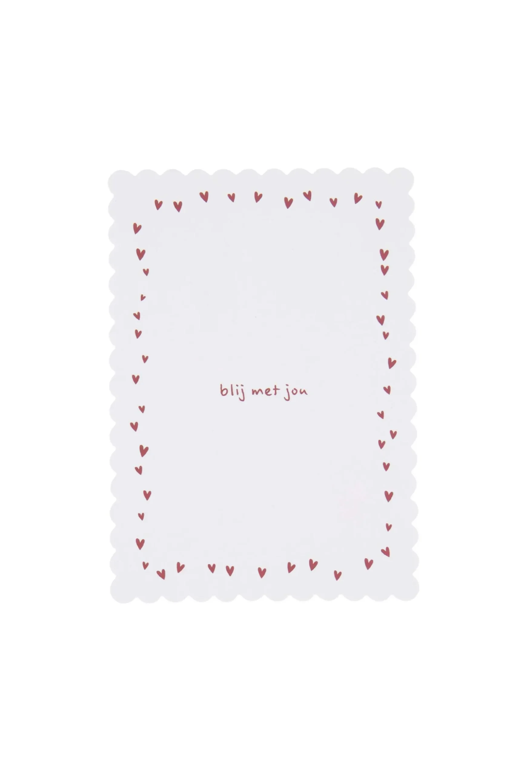 Zusss ansichtkaart blij met jou wit/rood|Wie maak jij blij met deze mooie kaart? Deze witte kaart van Zusss heeft een randje van rode hartjes en ‘blij met jou’ op de voorkant. Je kunt ‘m gebruiken voor allerlei gelegenheden. Het is altijd leuk om een kaartje te ontvangen of te sturen! Kijk ook eens bij de Zusss kadootjes! |Zusss: basic, stoer, uniek en een tikkeltje eigenwijs.