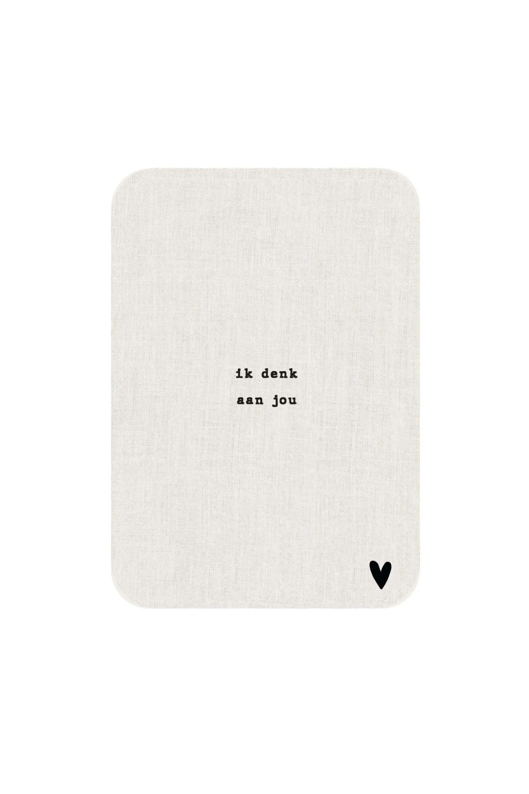 Zusss ansichtkaart ronde hoeken denk aan jou linnen|Met een lief kaartje tover je al gauw een glimlach op iemands gezicht! Deze ansichtkaart is voorzien van een linnen look met daarop de tekst: ik denk aan jou. Stuur deze bijvoorbeeld om iemand een hart onder de riem te steken! Om het plaatje helemaal compleet te maken combineer je deze kaart met een leuk Zusss kadootje!|Zusss: basic, stoer, uniek en een tikkeltje eigenwijs.