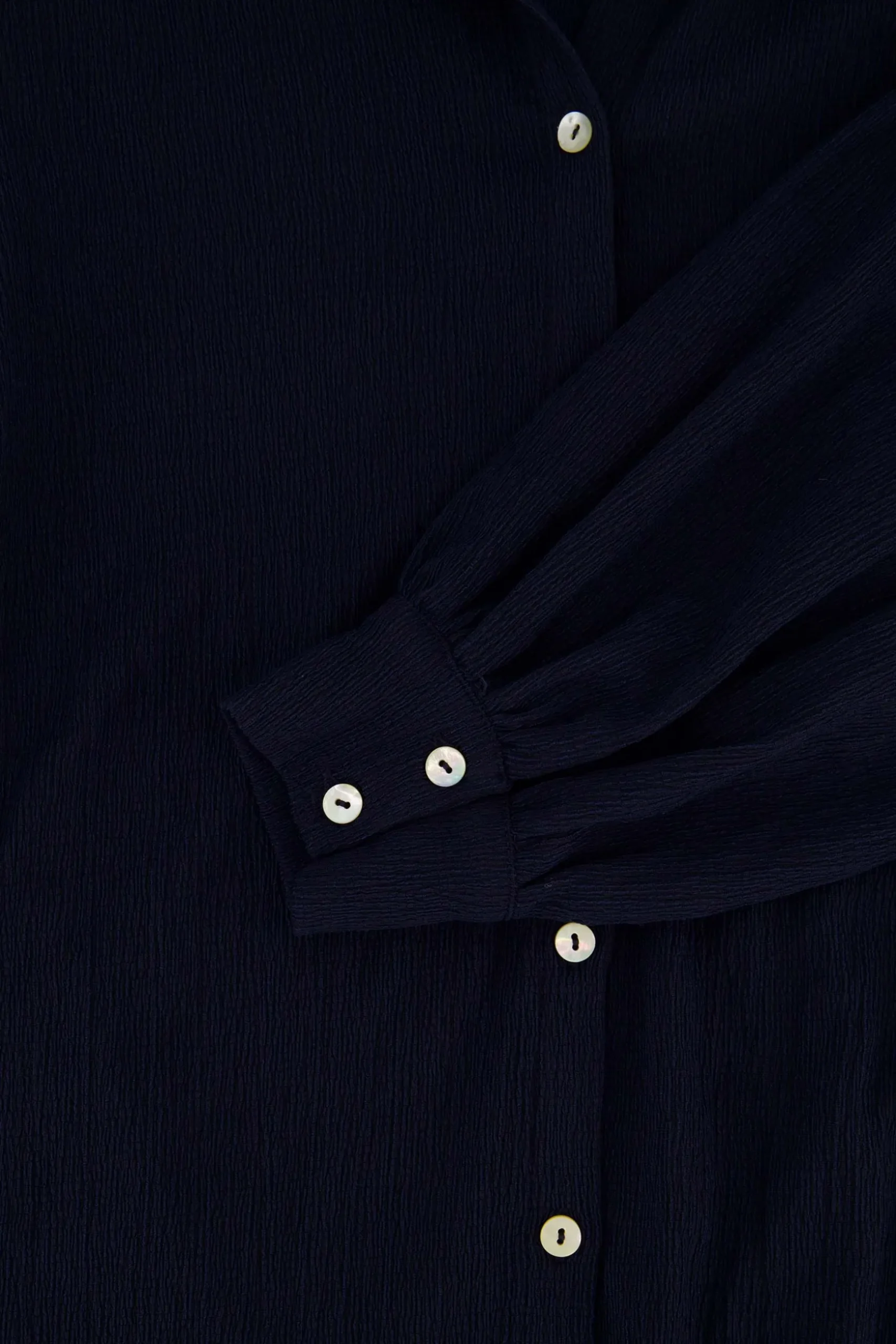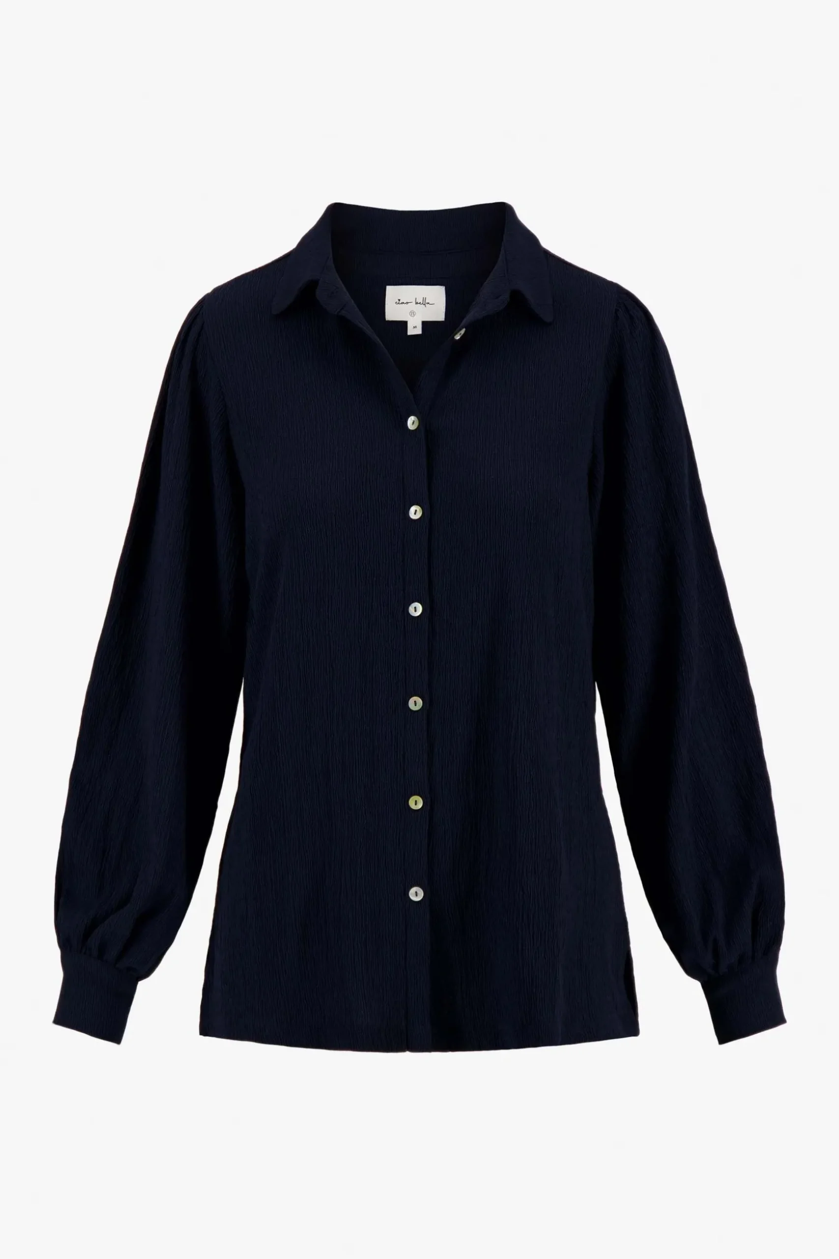 Zusss blouse in crinkle stof donkerblauw|Deze Zusss blouse is een perfect item om in je garderobe te hebben. Je draagt dit fijne model op een Zusss jeans of rok. De blouse is donkerblauw van kleur en heeft lange mouwen. De blouse is gemaakt van 98% polyester en 2% elastaan. Neem ook eens een kijkje bij de Zusss tassen. Welke bezorgt jou een glimlach op je gezicht?|Zusss: basic, stoer, uniek en een tikkeltje eigenwijs.