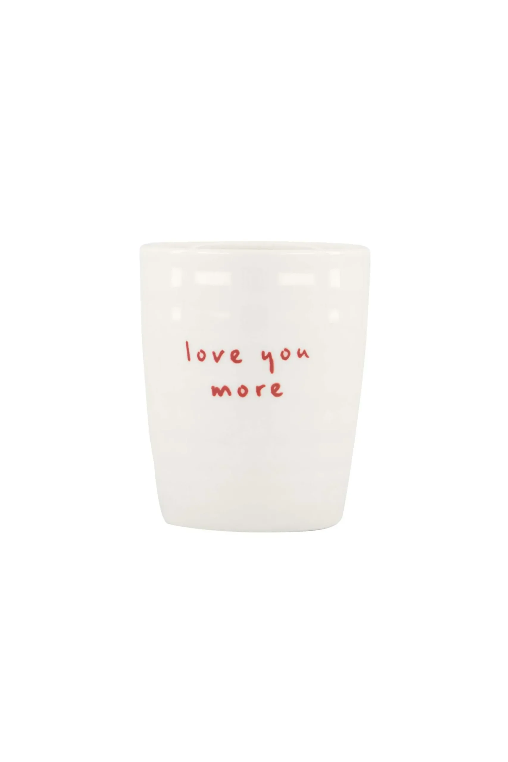 Zusss espressokopje love you more wit/rood|Dit espressokopje van Zusss is o-zo leuk! Op dit witte kopje staat in rode letters ‘love you more’. Ook erg leuk om cadeau te doen! Het espressokopje is gemaakt van aardewerk, heeft een doorsnede van 6cm en is 7cm hoog. Leuk om dit kopje te combineren met andere aardewerken items van Zusss. Je bekijkt ze in de categorie servies. |Zusss: basic, stoer, uniek en een tikkeltje eigenwijs.