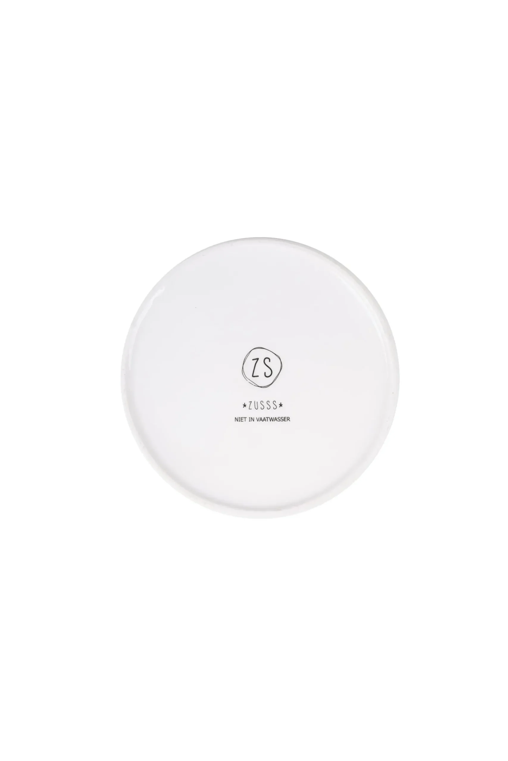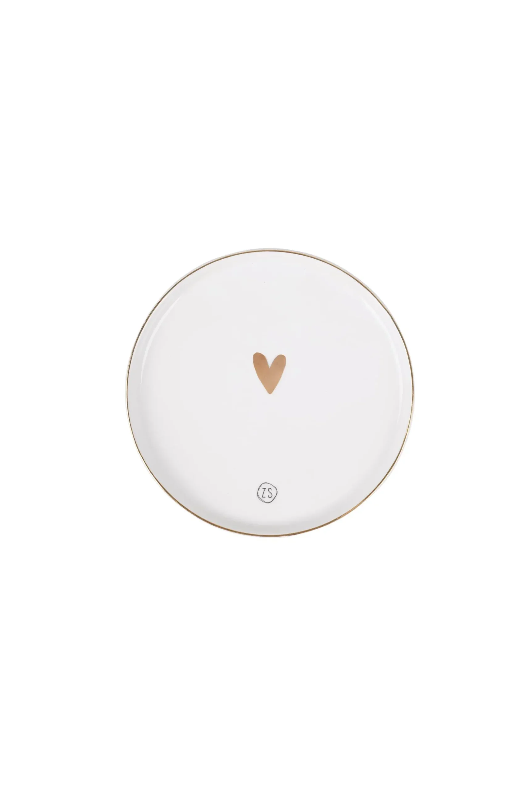 Zusss gebaksbordje met goud hartje en randje|Wat zou jij serveren op dit gezellige gebaksbordje? Iets lekkers op dit bordje waar een mooi gouden hartje op staat, is een gezellige combinatie! Naast het gouden hartje heeft dit gebaksbordje ook een gouden randje. Kenmerkend van goud geglazuurd servies is dat dit niet in de vaatwasser kan, vandaar dat je dit bordje ook met de hand af moet wassen. Het bord is gemaakt van aardewerk en is 15cm breed. Op de voorkant van het bord vind je ook een subtiel Zusss logo. Leuk om deze borden te combineren met andere aardewerk items met gouden hartjes. Je bekijkt ze in de categorie servies.|Zusss: basic, stoer, uniek en een tikkeltje eigenwijs.