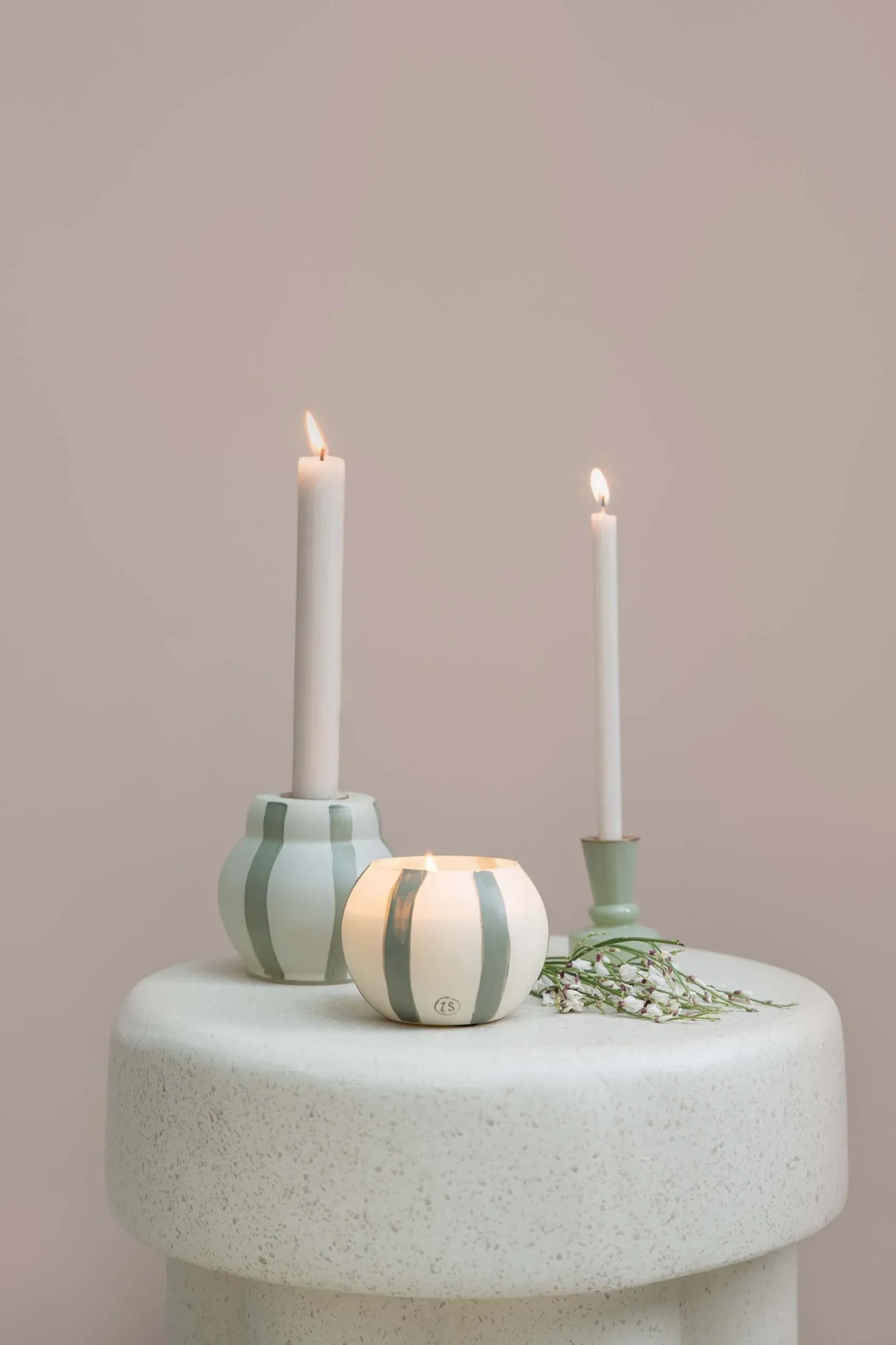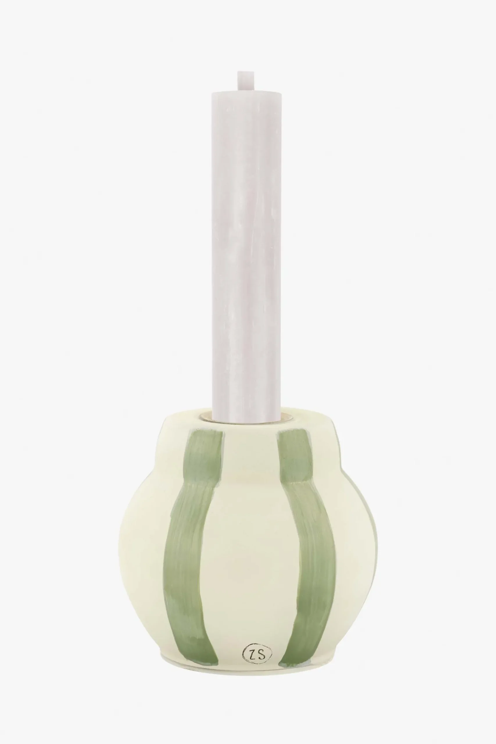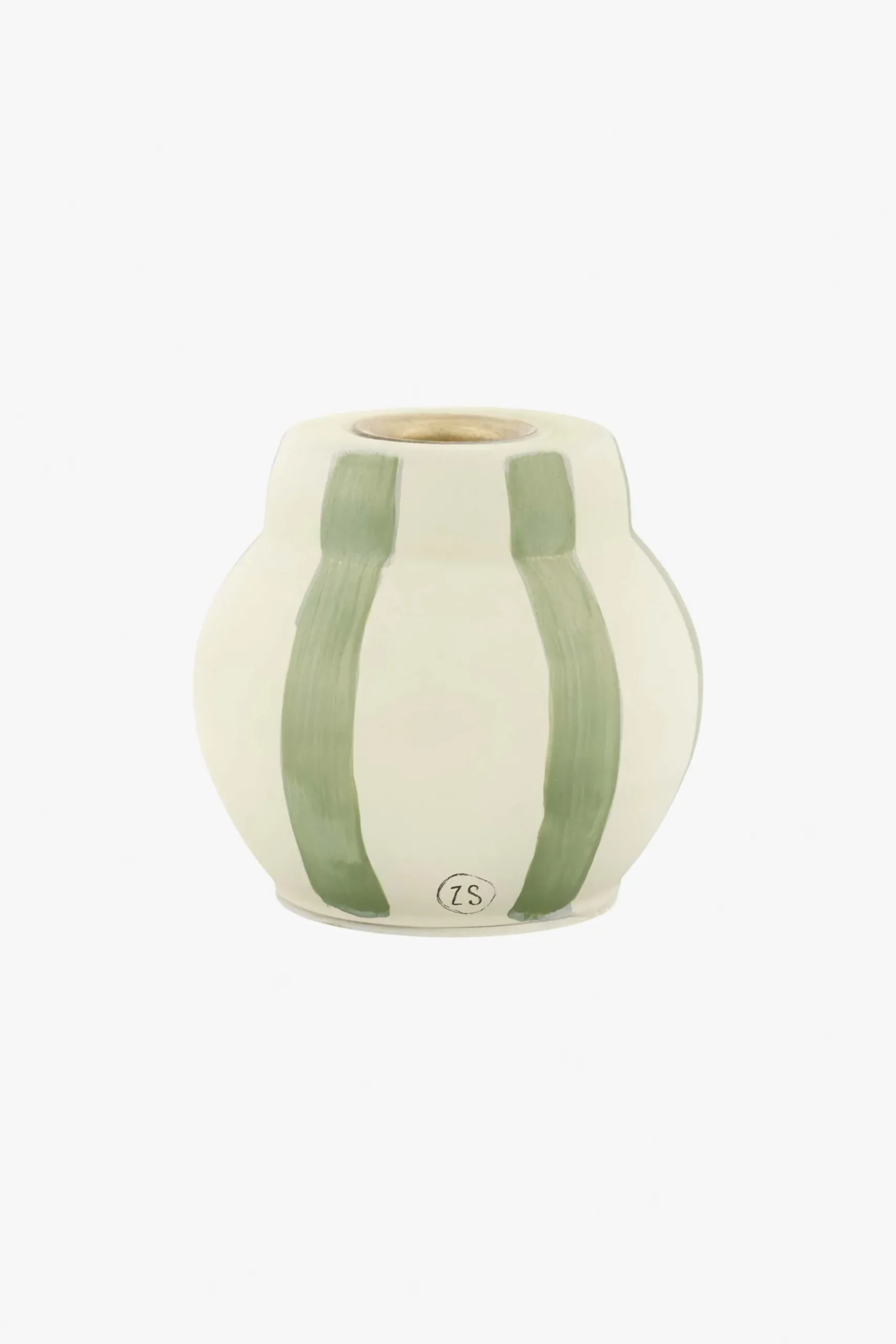 Zusss glazen kandelaar met strepen zand/saliegroen|Jaaa, dit pareltje wil je hebben! Deze glazen kandelaar van Zusss is lekker vrolijk. Zet hierin gezellig een kaarsje aan tijdens het diner of gewoon als je met je theetje op de bank zit. Deze zand en saliegroen gestreepte kandelaar brengt je helemaal in de voorjaarssferen. In deze kandelaar passen de rustieke Zusss kaarsen van 12cm en 20cm, en de geribbelde Zusss kaarsen van 20cm. De kandelaar heeft een doorsnede van 9 centimeter en is 8,5 centimeter hoog. Ook erg leuk als kadootje! |Zusss: basic, stoer, uniek en een tikkeltje eigenwijs.
