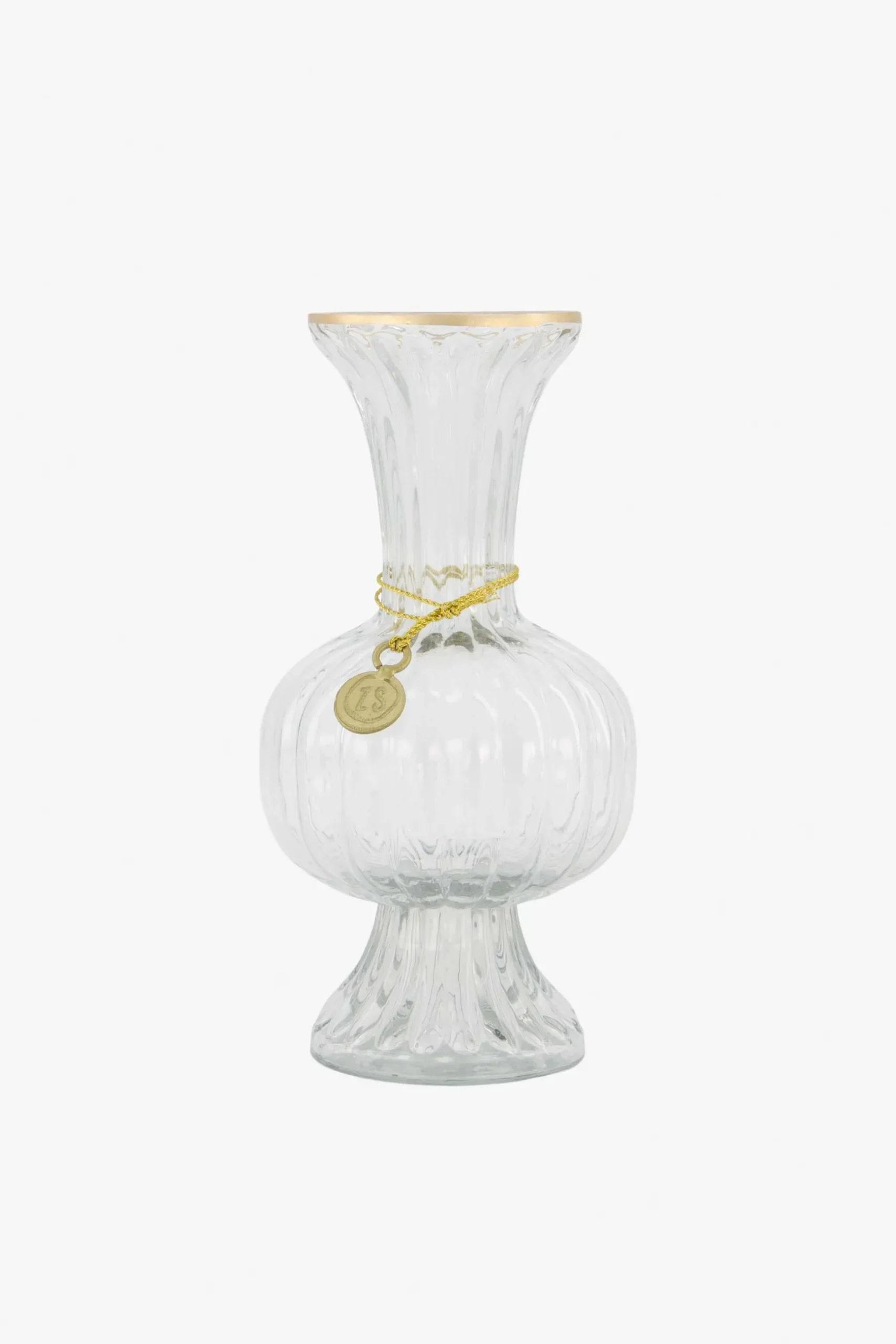 Zusss glazen ribbelvaasje S helder|Dit glazen vaasje is een echte eyecatcher! Dit vaasje heeft een unieke vorm en het glas heeft rondom ribbels. Een leuk detail is het gouden randje aan de bovenkant en het hangertje om de hals van de vaas. Zet dit te gekke ding op je salontafel en combineer ‘m met een mooie kandelaar! Dit glazen vaasje heeft een diameter van 9 cm en is 15 cm hoog. Kijk ook eens bij de andere woonaccessoires uit deze collectie!|Zusss: basic, stoer, uniek en een tikkeltje eigenwijs.
