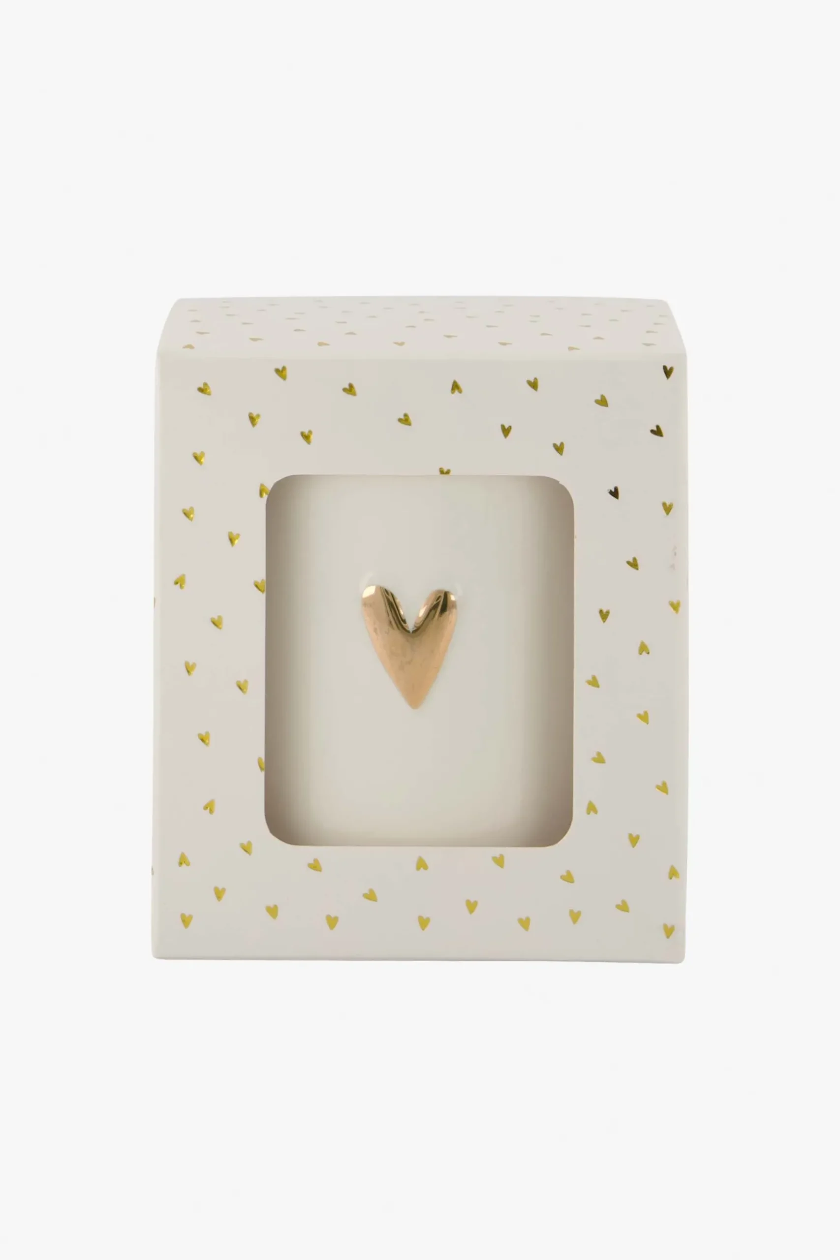 Zusss keramieken geurkaars in doosje linnen hartje wit|Deze geurkaars van Zusss is een sfeermaker in huis. De keramieken geurkaars is wit van kleur met daarop een goud hartje. Met deze heerlijke geurkaars verspreidt je de geur van fresh linen in huis. Combineer ‘m gezellig met gekleurde items! Dit item zit in een o zo leuk doosje met een hartjes print. Het formaat van deze geurkaars is 8,5×9,5cm en heeft ca 35 branduren. Ook erg leuk als kado!|Zusss: basic, stoer, uniek en een tikkeltje eigenwijs.