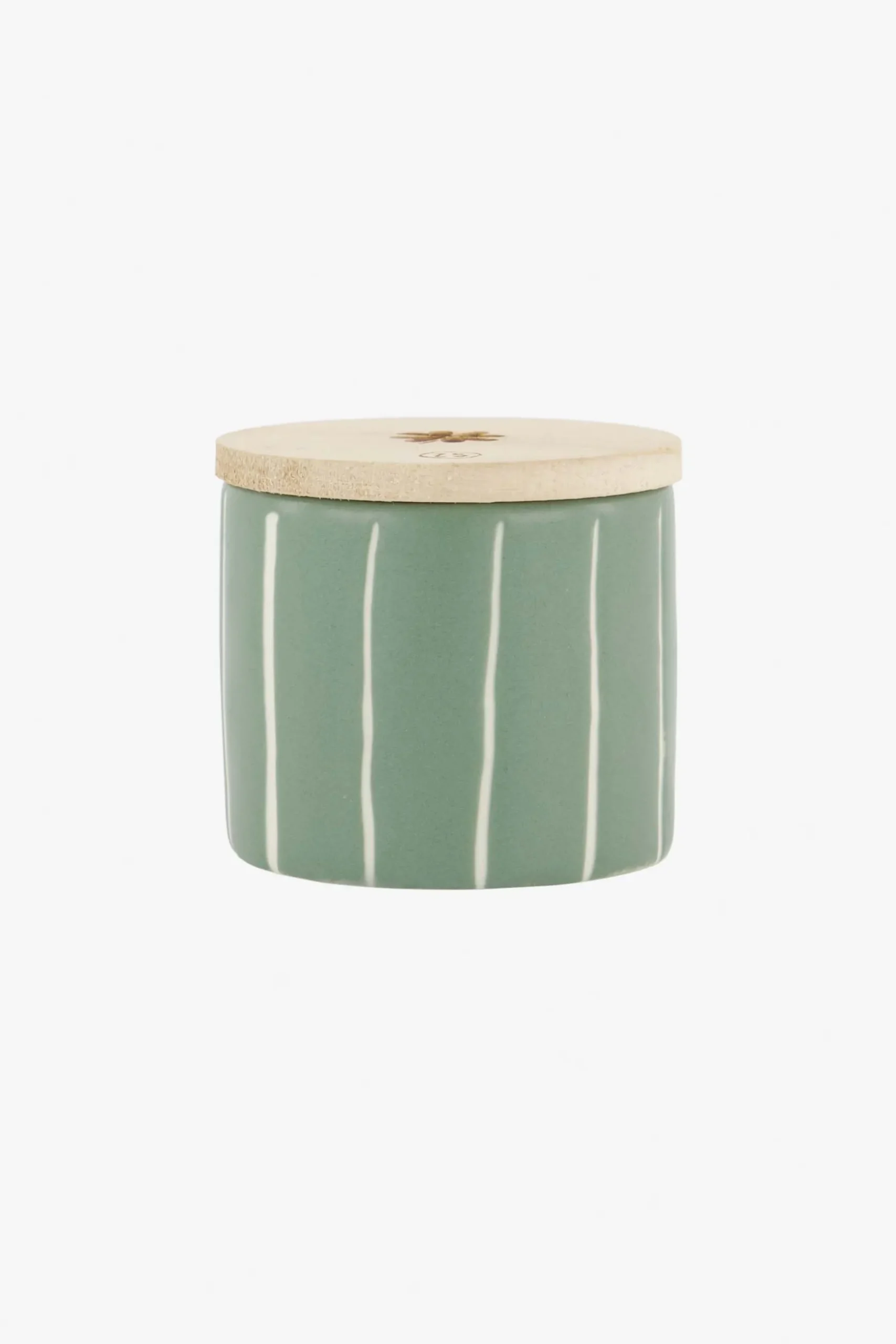 Zusss keramieken geurkaarsje met houten deksel klavertje salie|Keramieken geurkaarsje van Zusss met houten deksel. Deze leuke geurkaars laat je woonkamer heerlijk ruiken! Het saliegroene keramiek heeft subtiele witte streepjes rondom. In het deksels zijn een klavertje en het logo van Zusss gebrand. Met dit houten deksel kun je de geurkaars afsluiten, ideaal! De doorsnede van deze geurkaars is 5,5 cm en de hoogte 5,5 cm. Tip: geef dit potje geluk kado! |Zusss: basic, stoer, uniek en een tikkeltje eigenwijs.