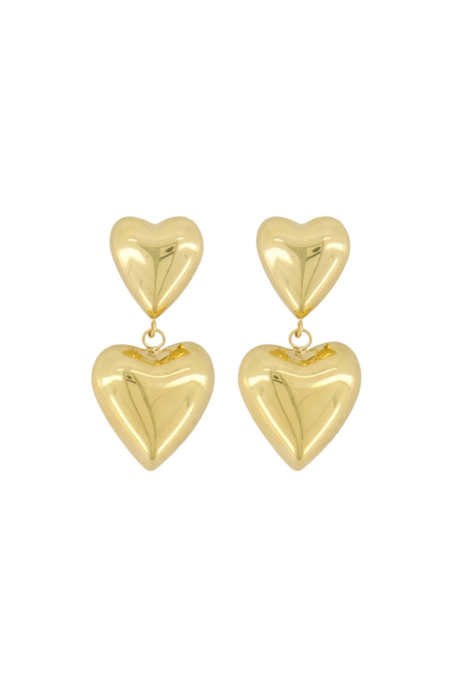 Zusss oorbel met twee hartjes goud|Deze oorbellen van Zusss zijn zo gaaf! De gouden bestaan uit twee hartjes die onder elkaar hangen. De oorbellen zijn 3,5cm lang. Wat een leukerds! De oorbellen zijn gemaakt van stainless steel en verkleurden hierdoor niet. Met deze leuke dingen val jij zeker op! Ook leuk om kado te geven!|Zusss: basic, stoer, uniek en een tikkeltje eigenwijs.