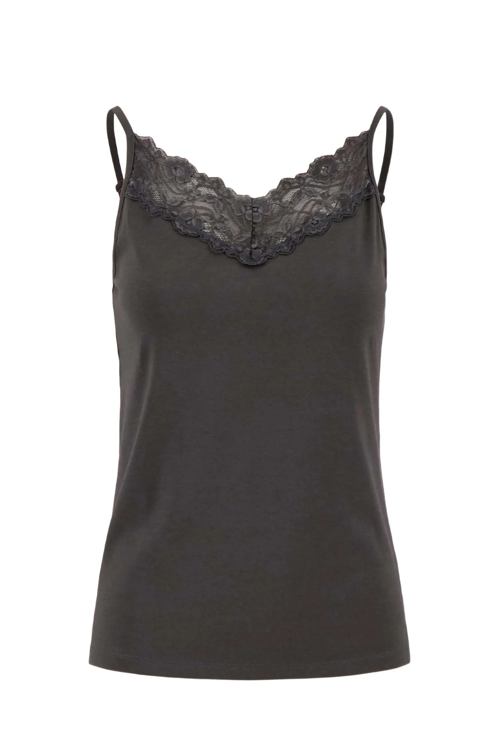 Zusss spaghetti top met kant antracietgrijs|Jaa deze wil je hebben! Een basic top komt altijd van pas. Deze fijne top van Zusss heeft spaghetti bandjes en een kanten rand bij de hals. Lekker sjiek! Je draagt ‘m zo of onder een Zusss blouse of vest. Met dit antracietgrijze item kun je alle kant op! Deze leuke top is gemaakt van 57% katoen, 38% modal en 5% elastaan. Kijk ook eens bij de Zusss mooimakersom je outfit af te maken.|Zusss: basic, stoer, uniek en een tikkeltje eigenwijs.