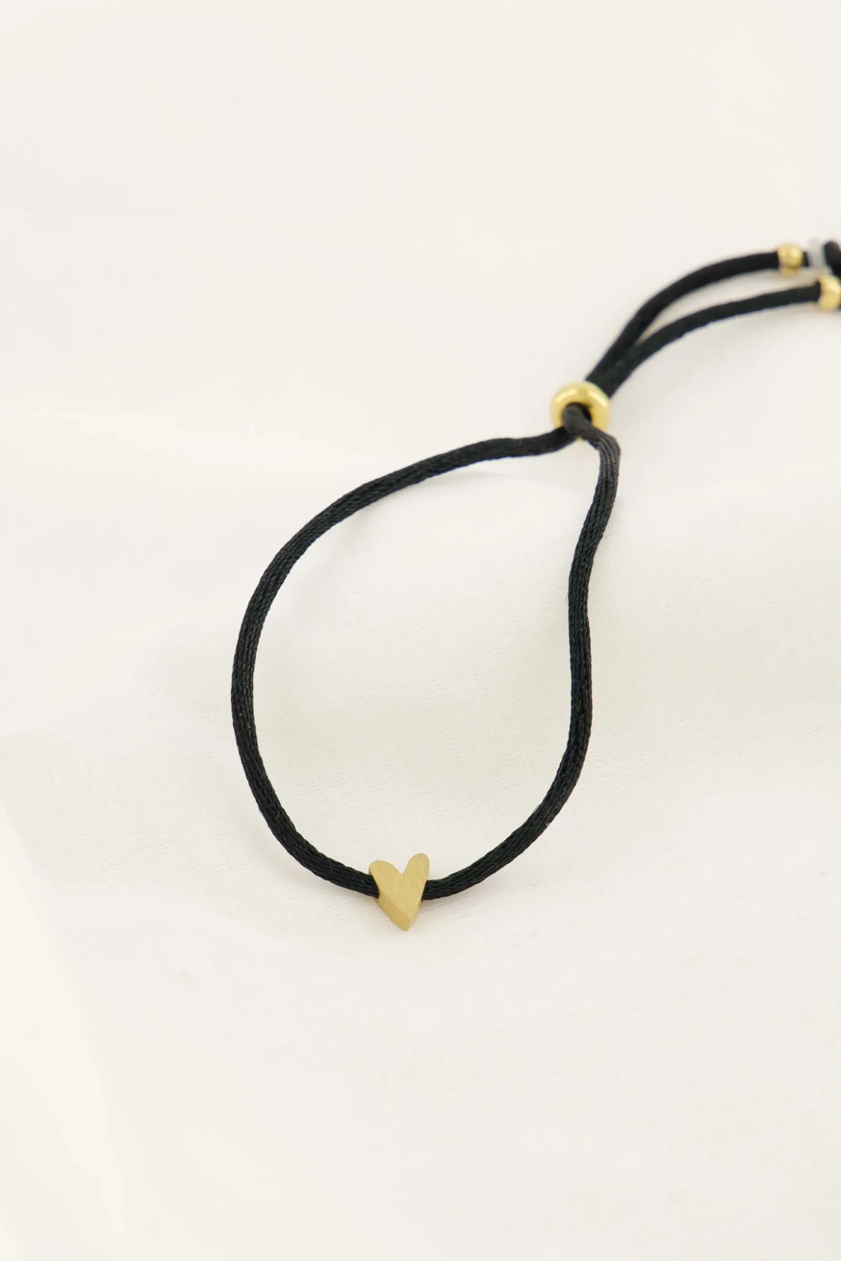 Zusss touwarmbandje hartje zwart|Om verliefd op te worden, die touwarmbandje van Zusss. Dit armbandje is lekker speels en toch basic. Aan het zwarte bandje hangt een gouden hartje. Combineer ‘m met andere gouden sieraden! Het goud aan het armbandje verkleurd niet, want dat is gemaakt van stainless steel. Het armbandje is volledig verstelbaar, zo past ‘ie iedereen. Aan wie geef jij deze kado?|Zusss: basic, stoer, uniek en een tikkeltje eigenwijs.