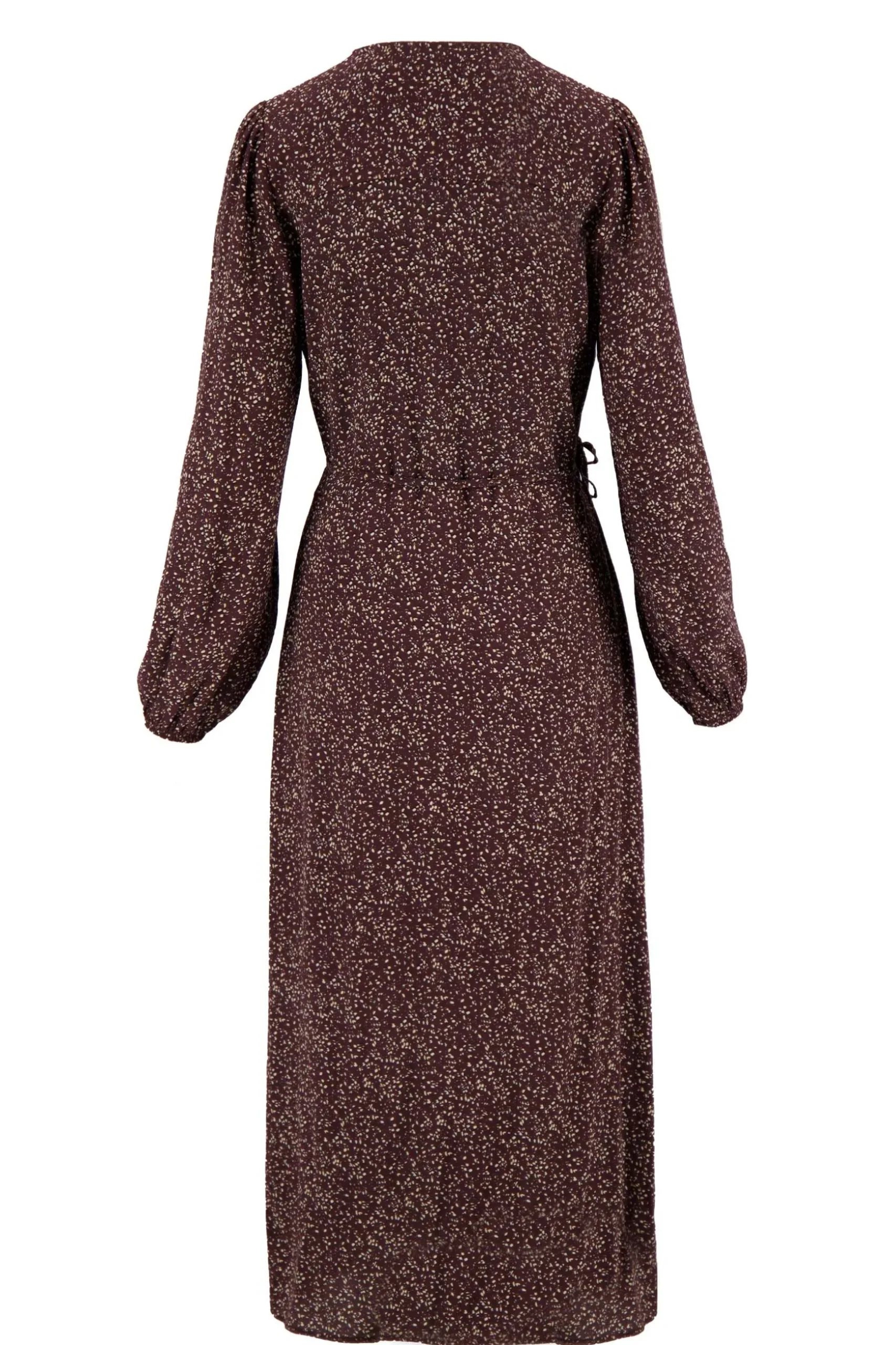 Chocoladebruine Zusss wikkeljurk met print| Oelala, deze chocoladebruine wikkeljurk accentueert precies wat je wilt. De V-hals is niet te diep en met de touwtjes in de zij maak je een leuke strik. De lange mouwen poffen een beetje en over de hele jurk zitten beige stippeltjes. Je trekt de jurk aan naar je werk met platte boots eronder of naar de verjaardag van je bestie met een hakje. Vind je de dunne stof te koud? Dan doe je er gewoon een dik, warm Zusss vest over aan. Dankzij dun 100% viscose valt de jurk lekker soepel en droogt hij na een wasbeurt snel. Was ‘m op 30 graden met soortgelijke kleuren en laat drogen op een hanger.|Zusss: basic, stoer, uniek en een tikkeltje eigenwijs.